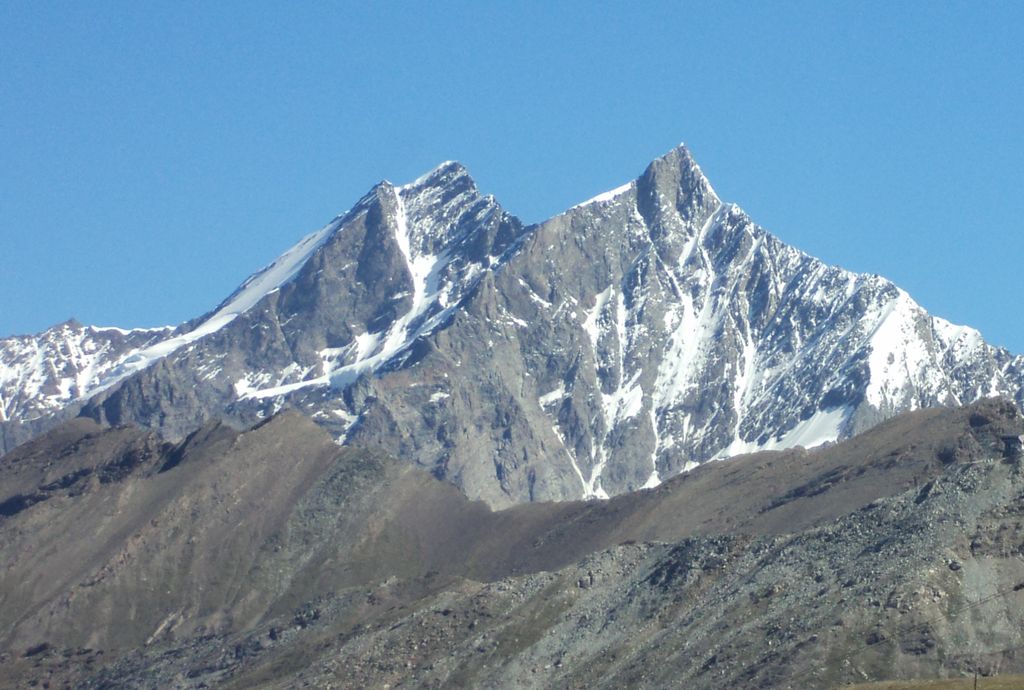 7:50 Breithornpass (3 345 m) i s Breithornem samotným (hor s tímto názvem je v Alpách mnoho), kde nás bylo v roce 2009 mnoho (byl to můj první expediční pokus v Alpách, být na více místech – pokus o Monte Leone, Aletschhorn a Gran Paradiso, viz Kronika). My chceme na Monte Leone, tentokráte zkusím(e) vyjít.