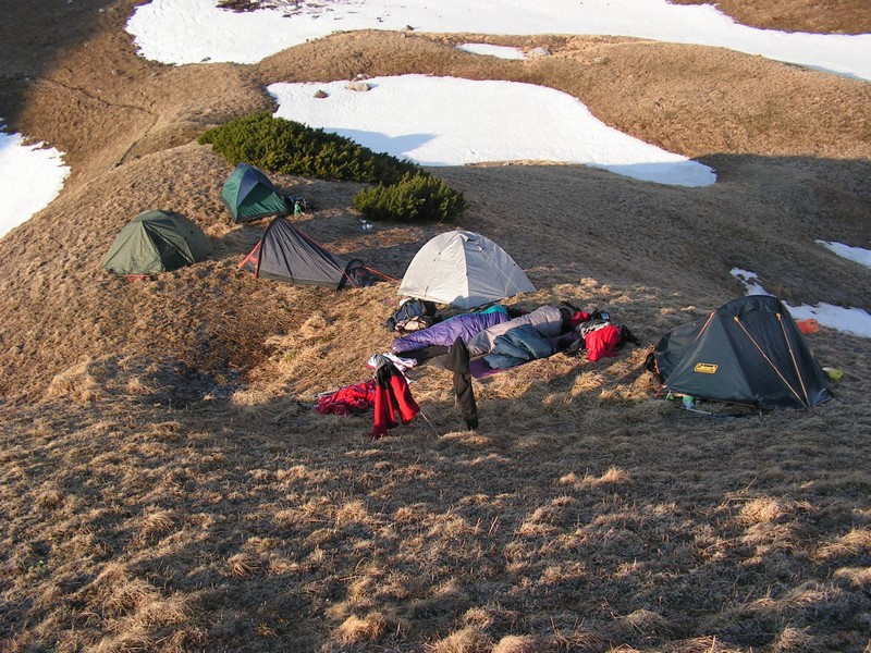 ten večer jsme, až na výjimky, došli pouze za sedlo, kde jsme postavili stany, popř. si ustlali pod širákem a dívali se na vrchol Eisenerzer Reichenstein z opačné strany, než jsme měli. Plán byl jasný, seznámit se, vyspat, počkat na opozdilce a pokračovat dál. -