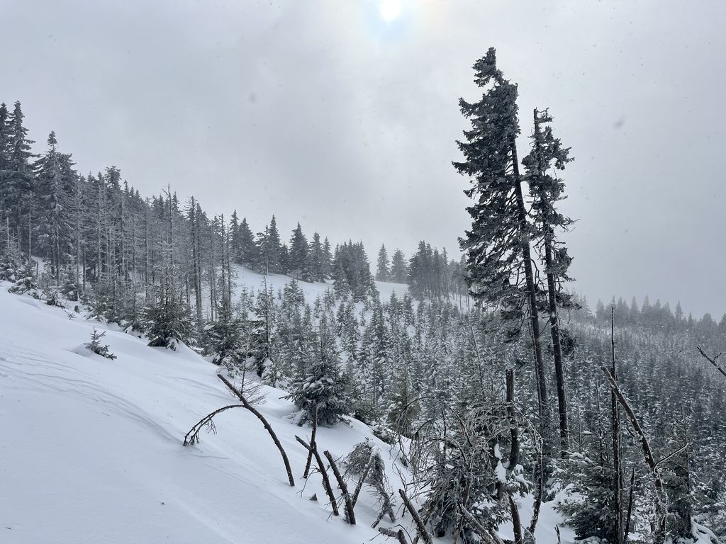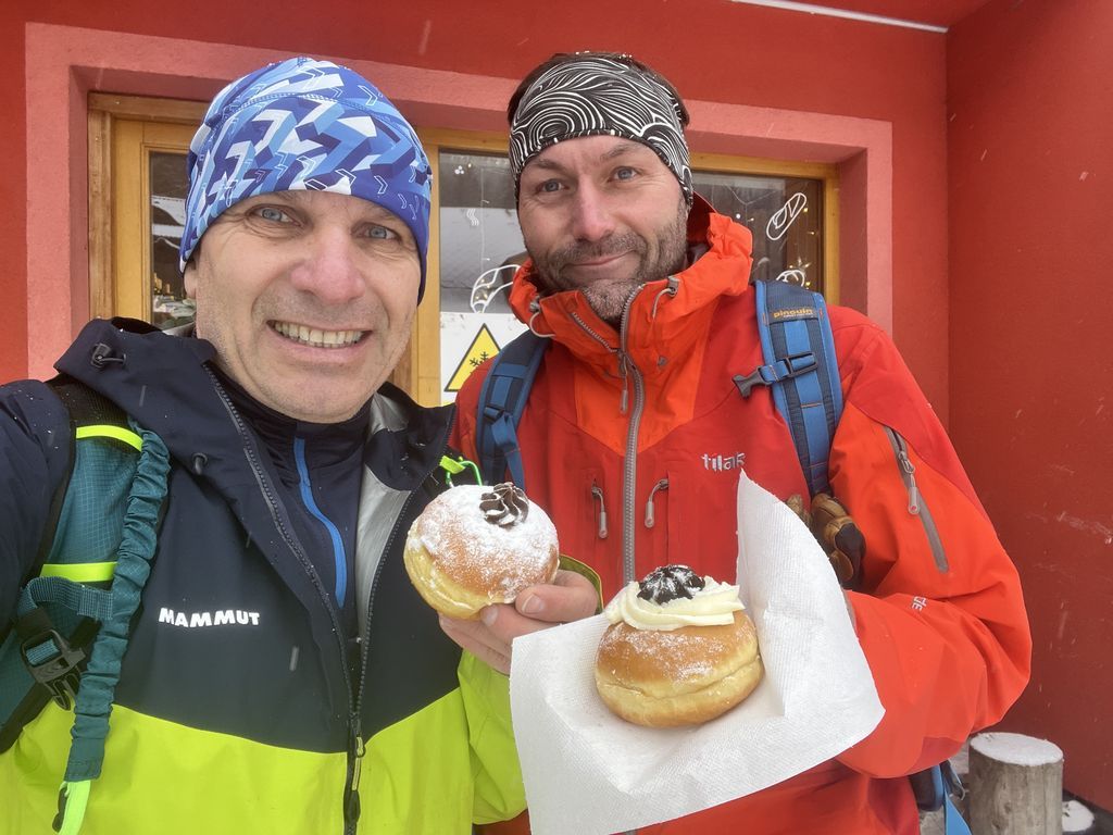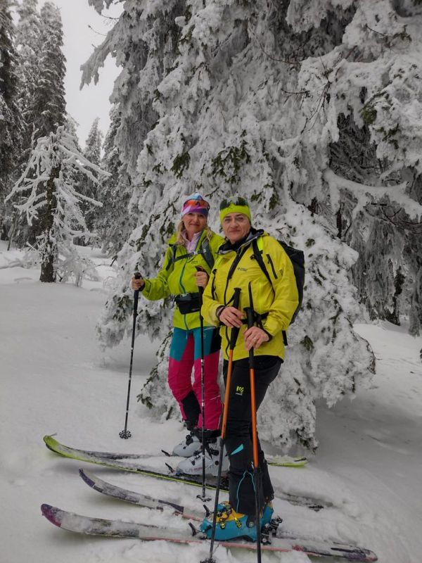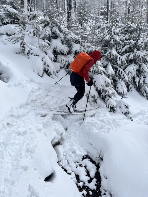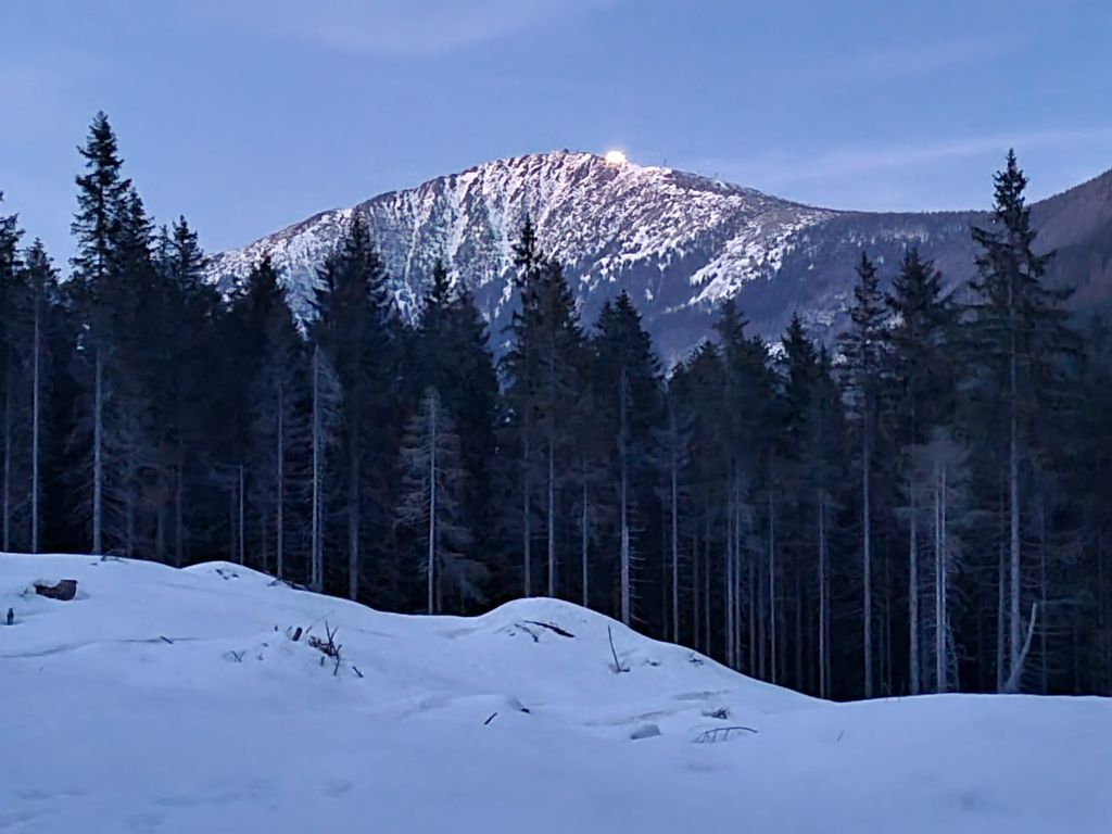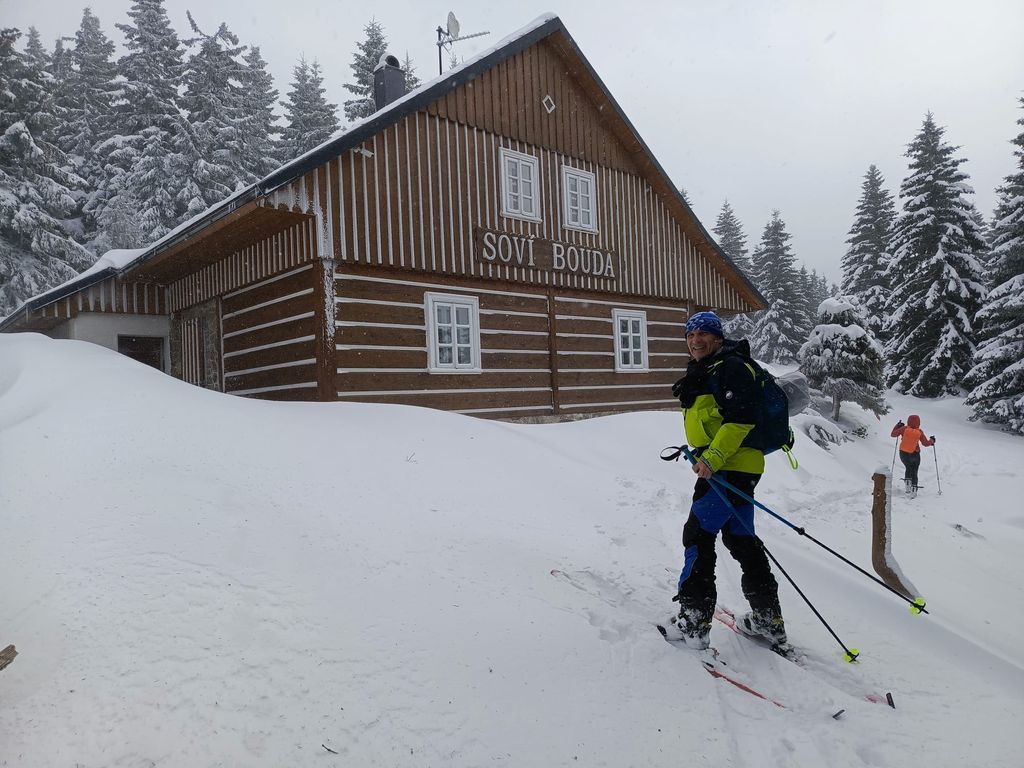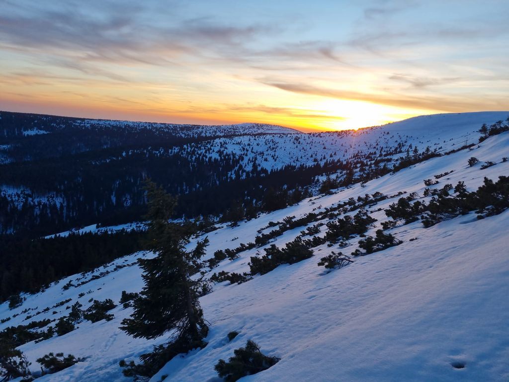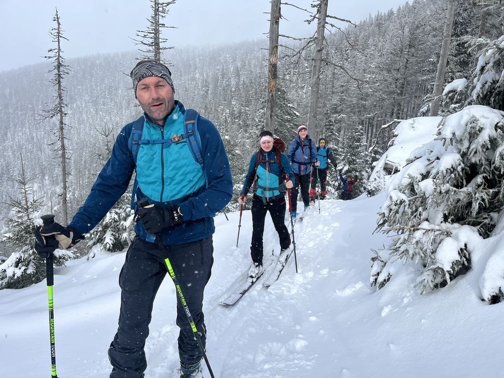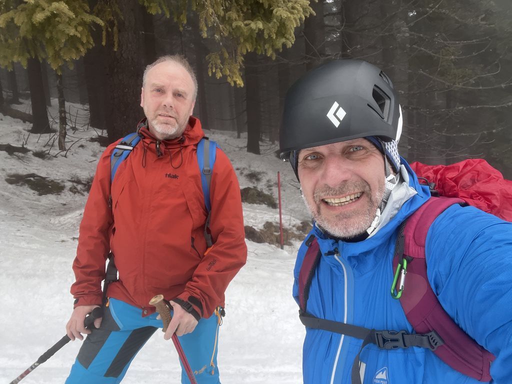 Ráno Marťa a Jagyč skialpy na Černé hoře nad Janským a Rudolfovým potokem.
