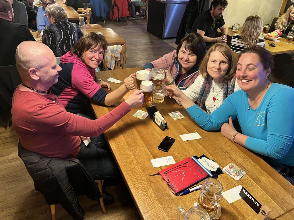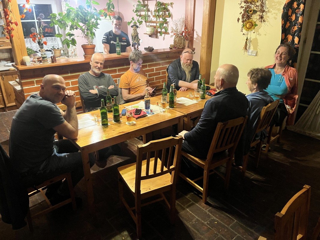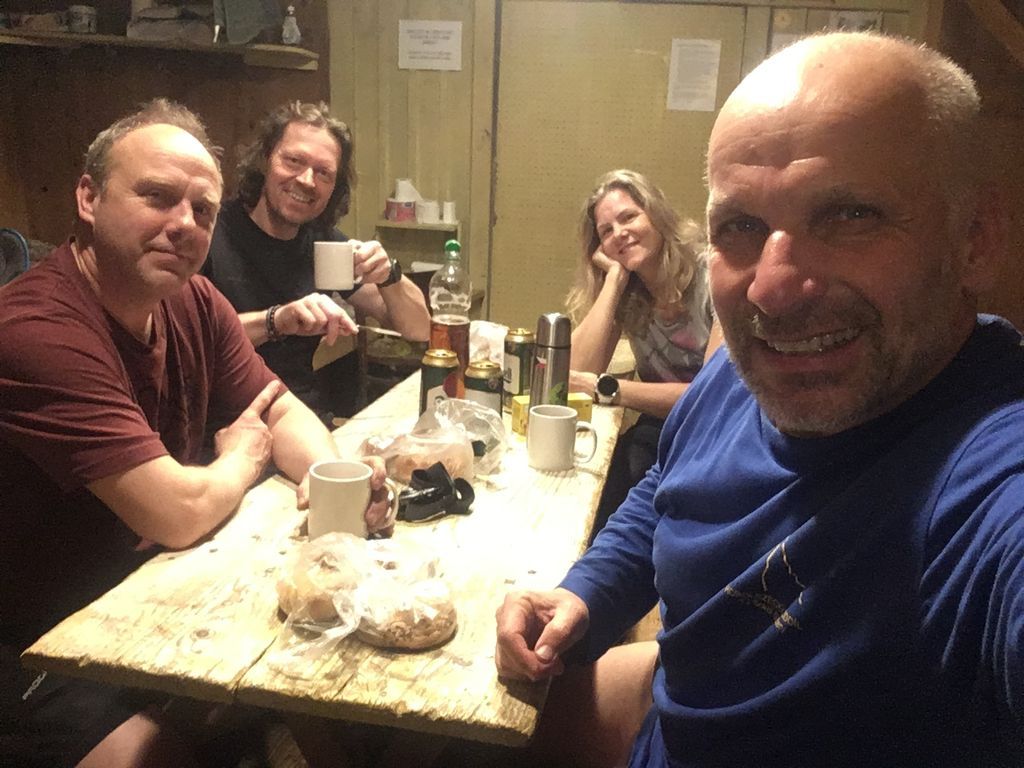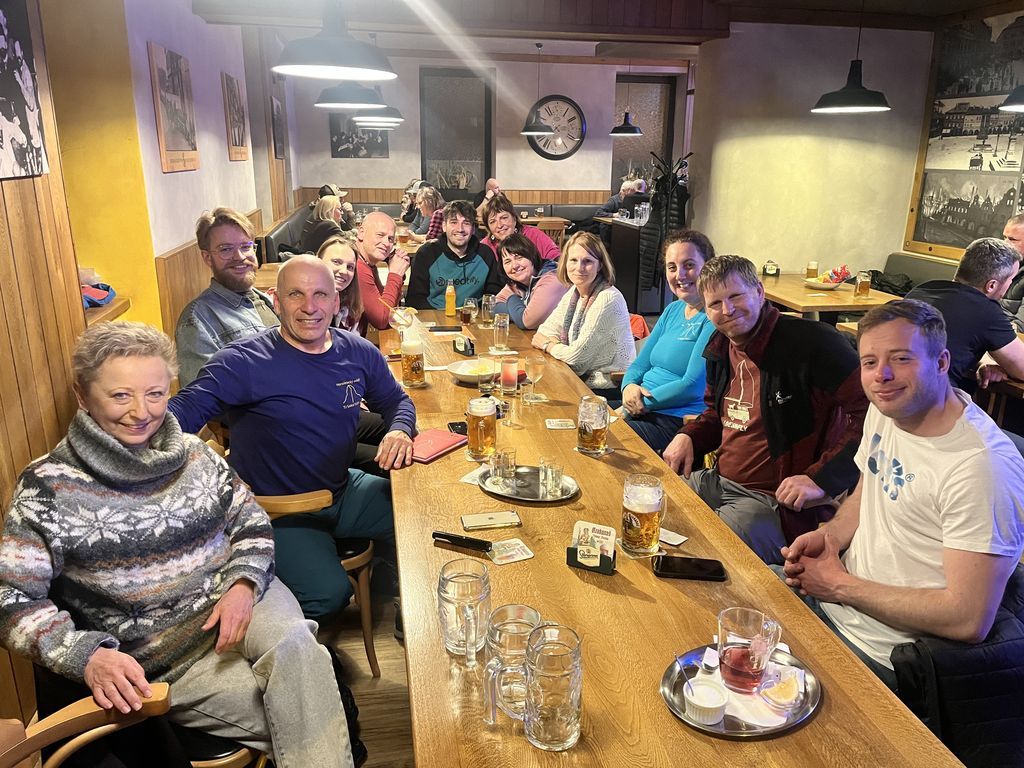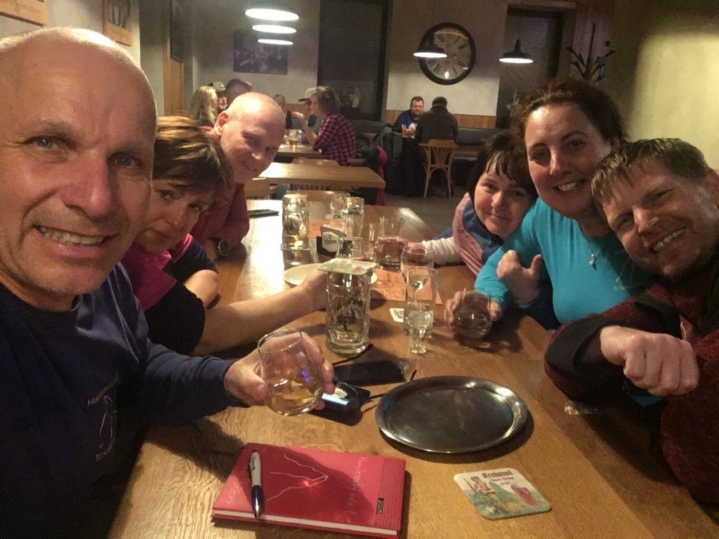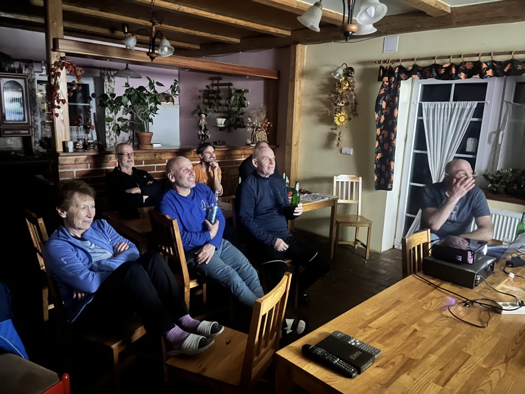Večerní program měl začít v 18:00 a tak se i stalo. Bylo to báječné setkání. K Machačovi dorazilo 13 účastníků posezení, ženy se postaraly o veselou, nekončící zábavu, chlapci zdatně sekundovali. Do půlnoci v pohostinství, do dvou na chatě Sněženka.