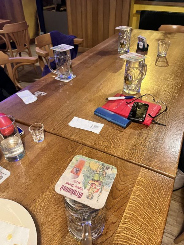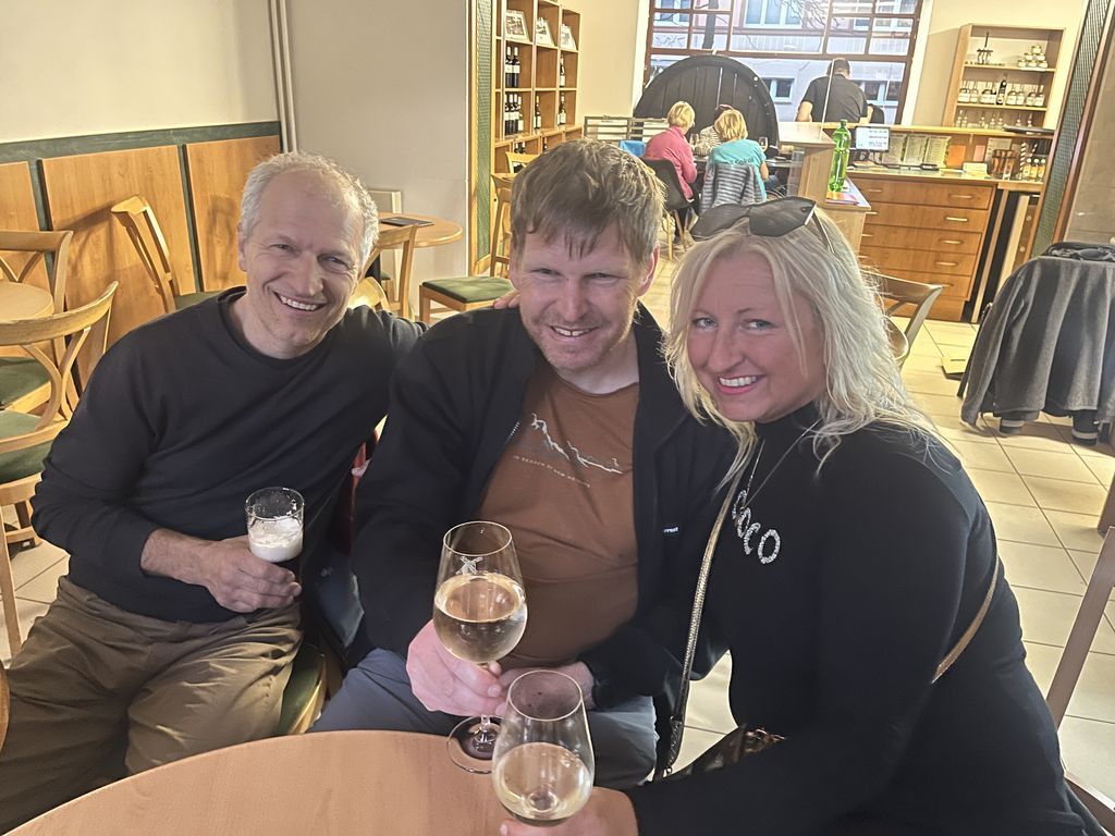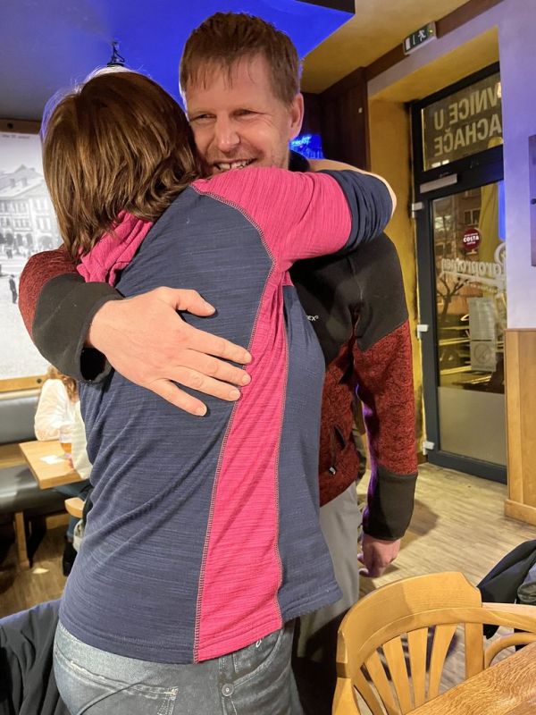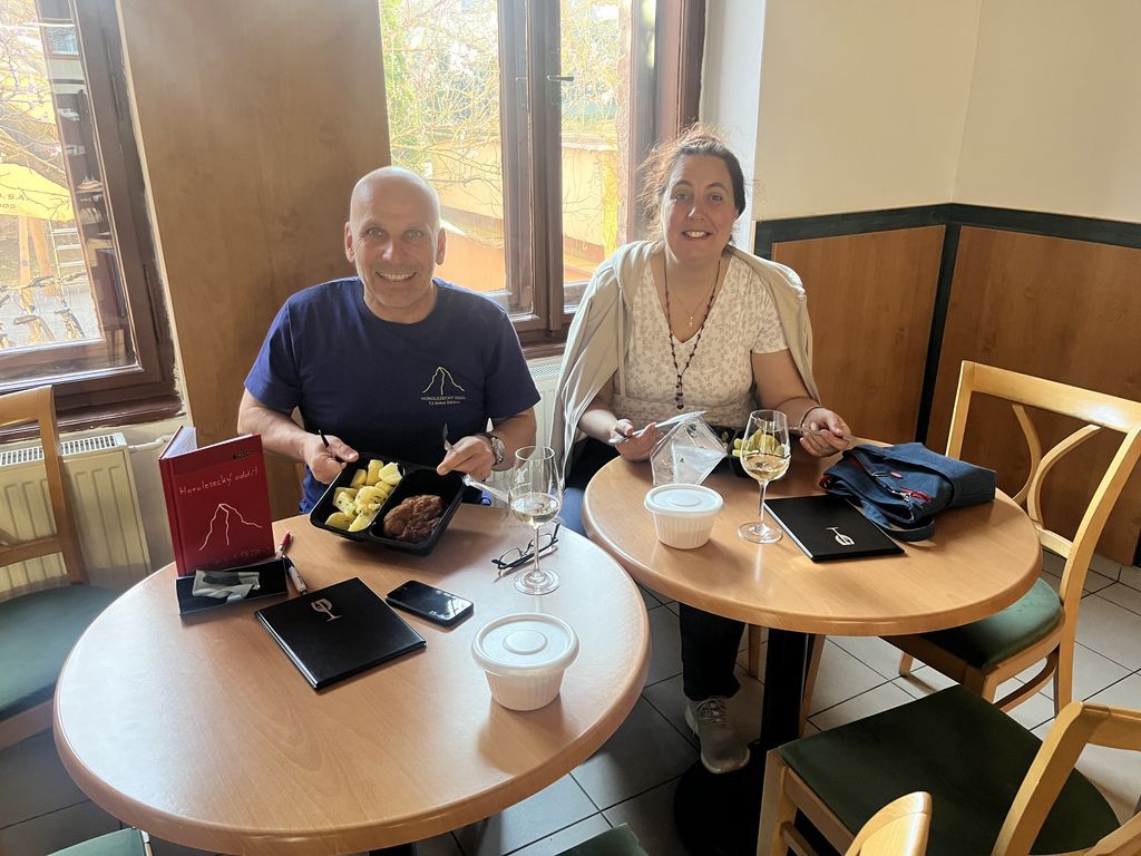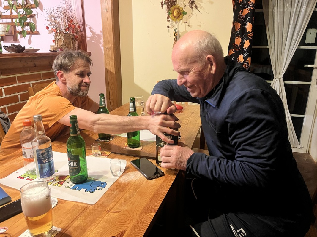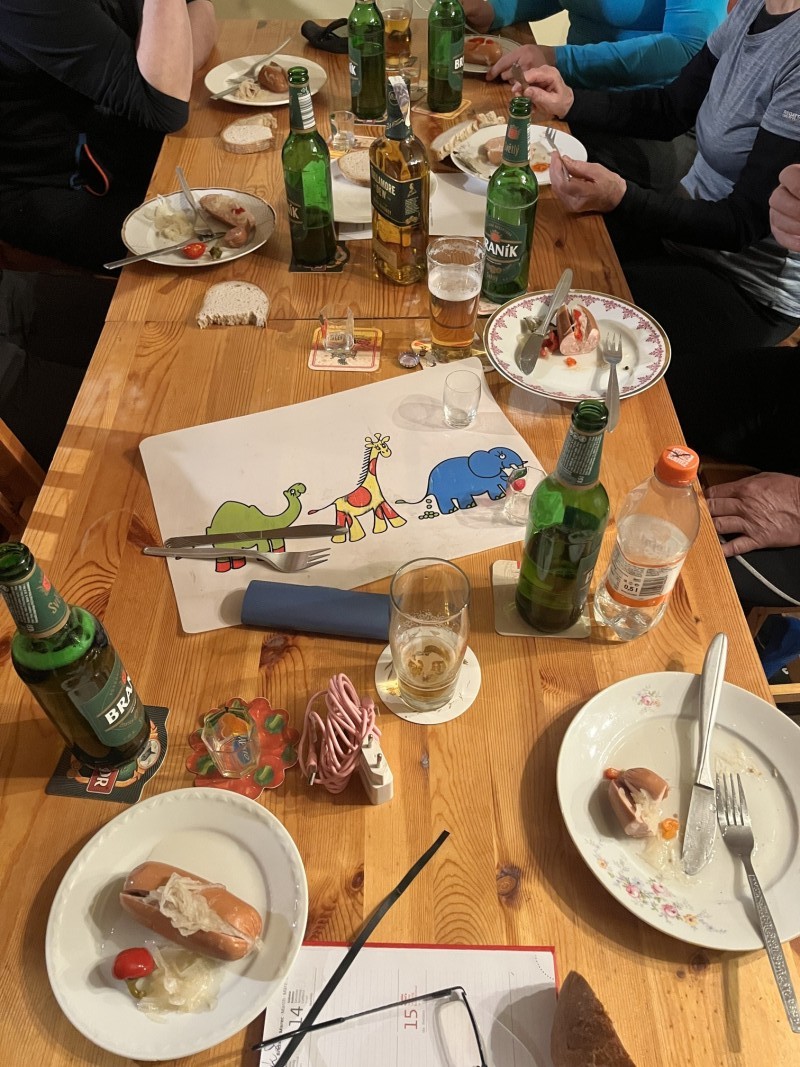 Vulkán, 9.4., začal prohlídnou nově (7.4.) otevřené restaurace. Moc se tam nezměnilo, ale obsluha byl příjemná, nabízela dokonce ještě menu (149 Kč), tak jsme si domluvili jídlo s sebou. Po přivítání s Tomem a prvních douškách lahodného muškátu jsme si pro jídlo došli: velké porce a v rámci meníčka i polévka zdarma. Mňamka! Pak se k nám přidala Kakamila, kterou jsme tam jednou viděli. Byla veselá, vtipná, prostě zapadla. A po nějaké době se zjistilo, že je to kolegyně Luďka. V 19:50 přichází lezci, podpoří veselost, aby Stěžeráci ve 20:45 prchli do „rodné“ vesnice. Někdo domů, někdo ještě tradičně za Gabíčkem. Bylo to další veselé setkání, v příjemném prostředí, s fajn lidmi.