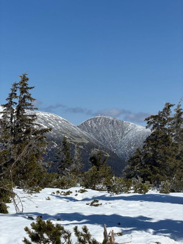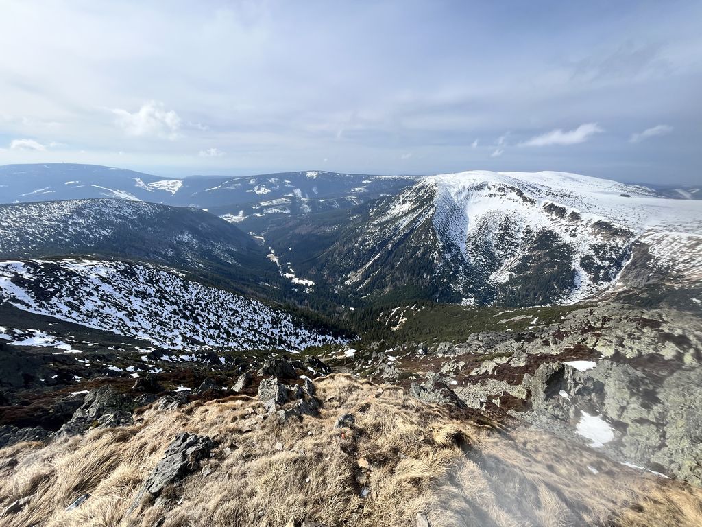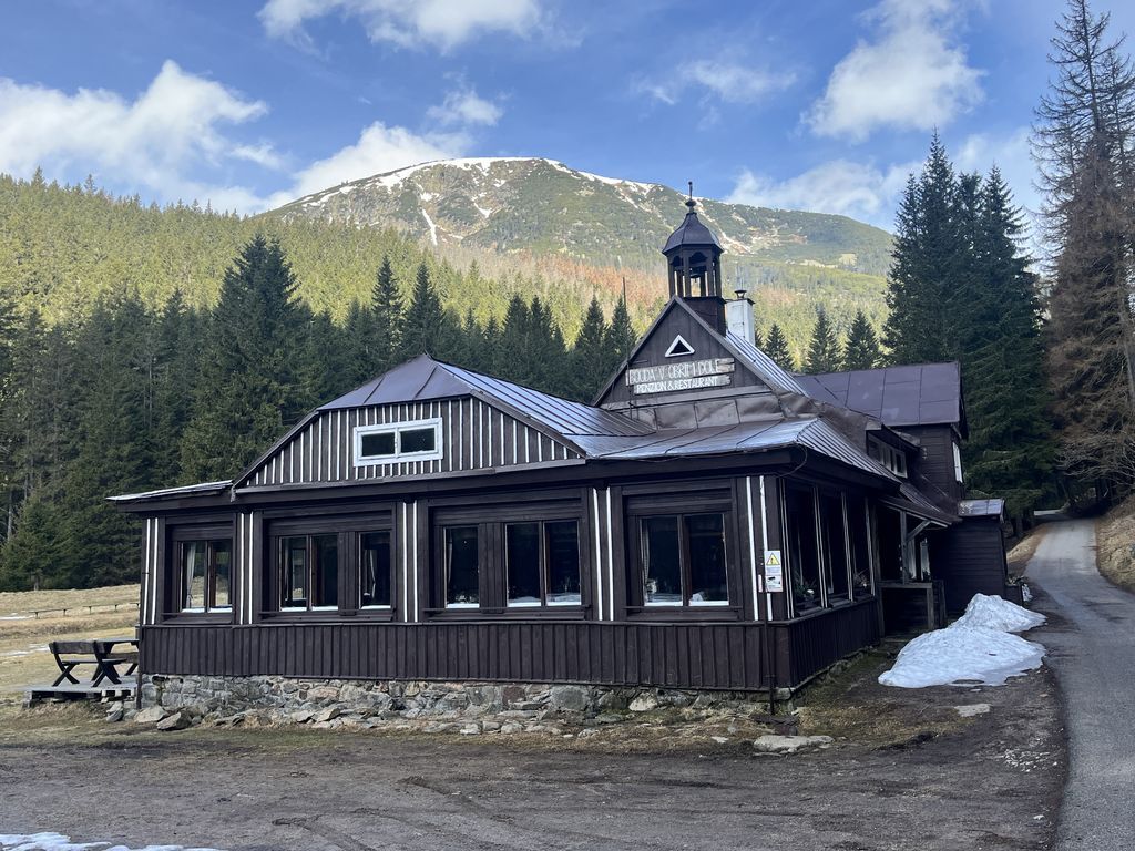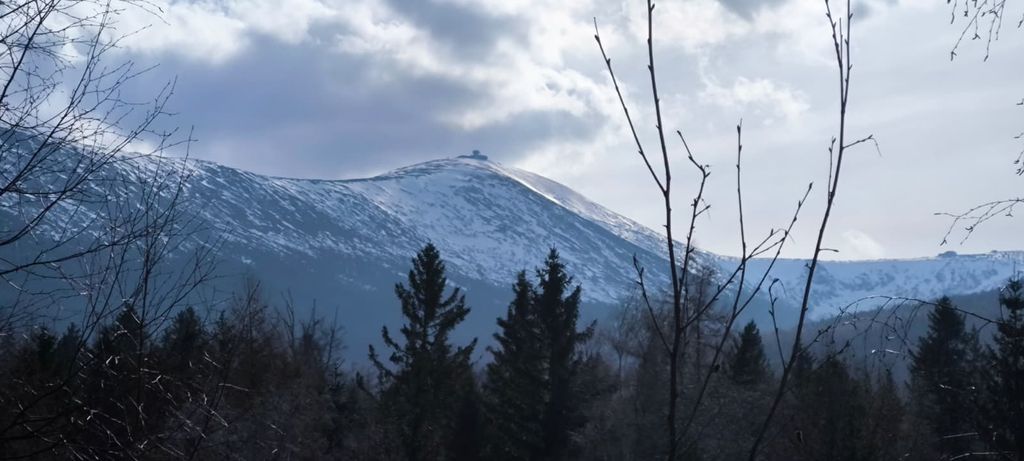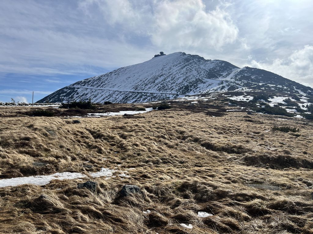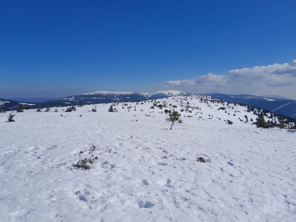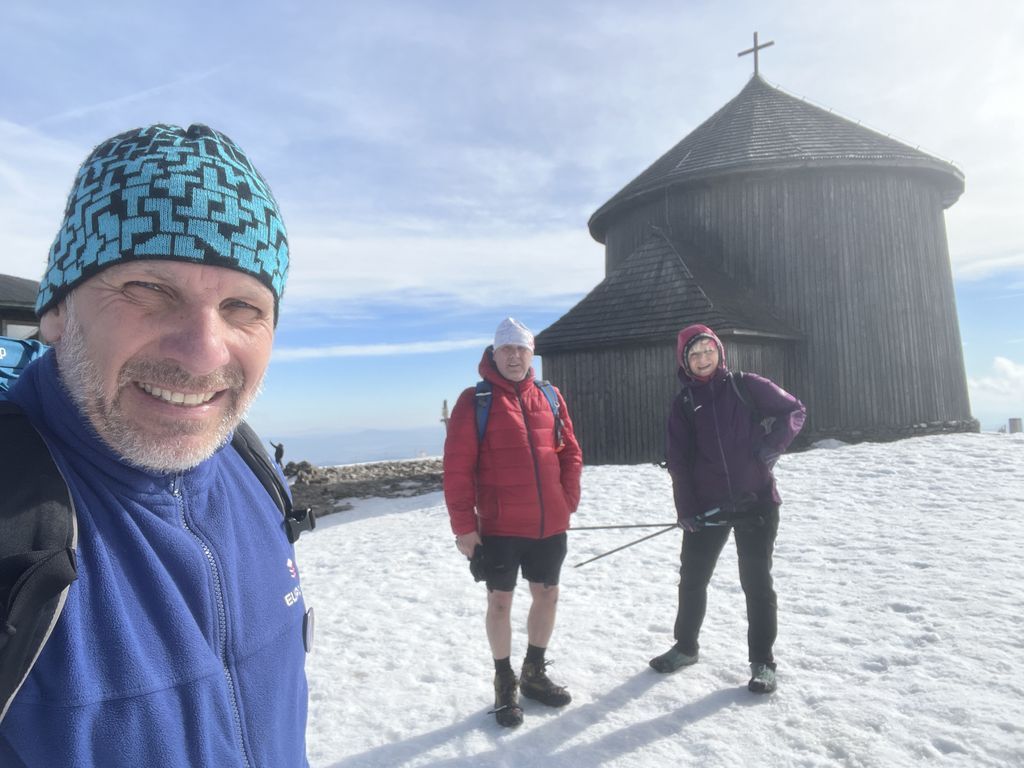 Ráno v 8:30, za pěkného počasí, vyrážíme já, Šíma a Hanka, s nesmeky v kapse a hůlkami v rukou, na první letošní Sněžku. Tempo skvělé, výhledy nádherné, příjemné povídání, v sedle a až na vrchol klasický vichr z hor, abychom v 10:15 stanuli u kaple svatého Vavřince, vysvěcené 10. srpna 1681. Dáváme kávičku a hlt z placky, loučíme se s Hankou, jenž si pošlape dál, a se Šímou prcháme zpět, neb jsem zanedbal přípravu a zjistil, že mi za hoďku a půl jede bus do Trutnova. Nu, byl to mazec v tom terénu, ale za 50 minut jsme u chat, sbalit a autobus opravdu stíhám(e).