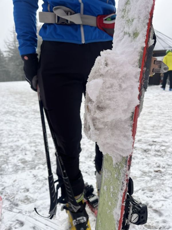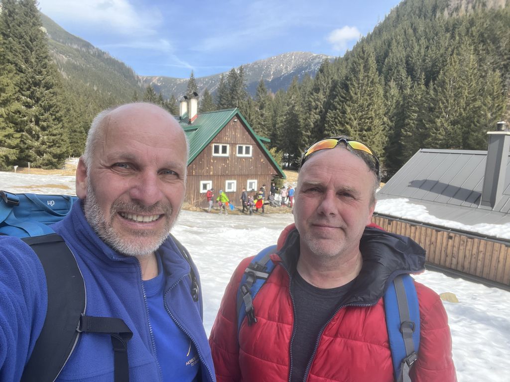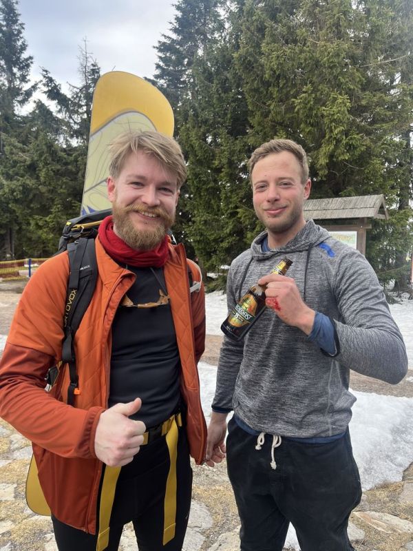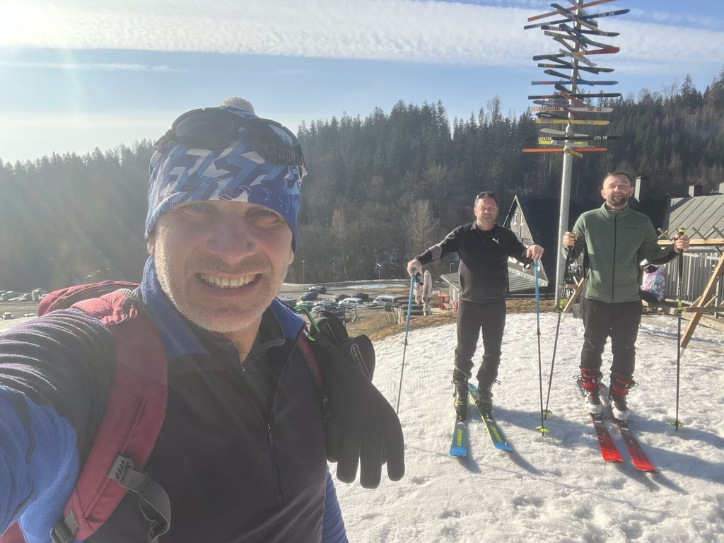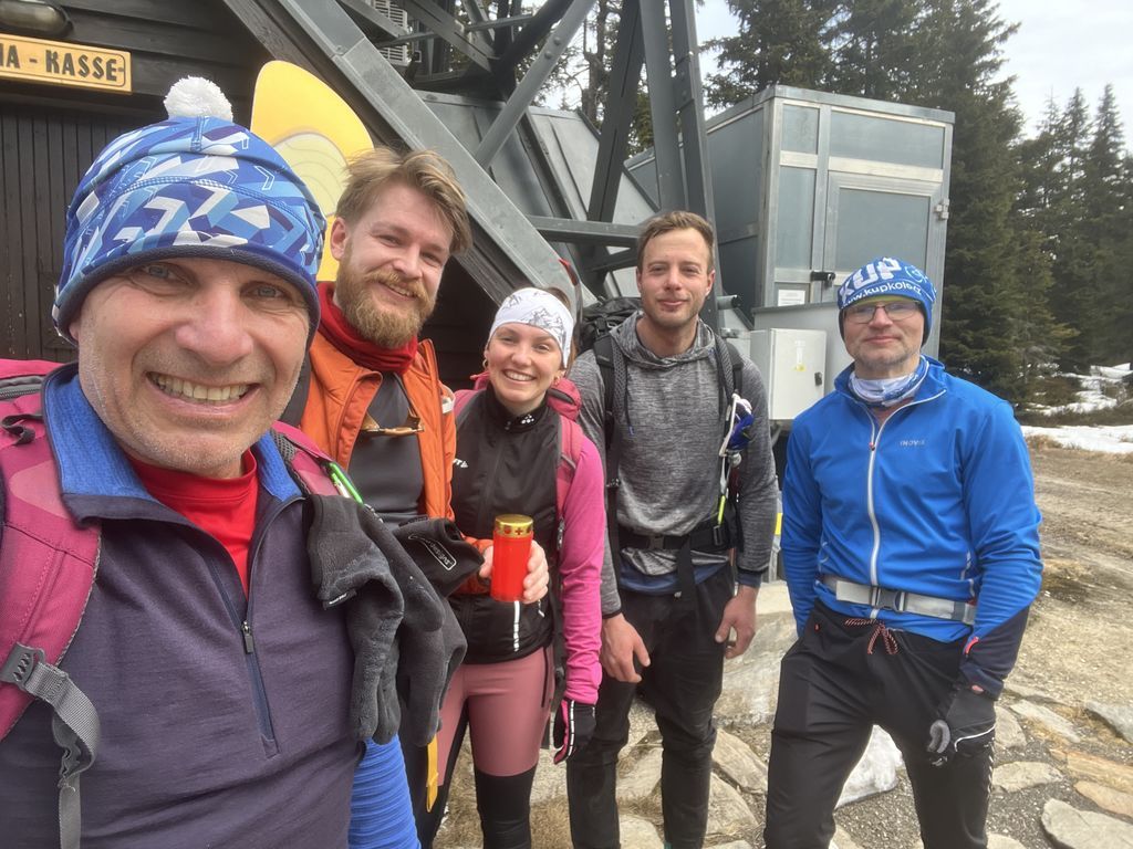 Po noci krátké a po …, nezbylo než se probrat, najít střízlivého řidiče a vyrazit na první ranní start v sedm hodin. Snídaně cestou, vyprošťovák na parkovišti, foto u lanovky. Optimismus v dobrý výkon nám vlil do žil Jagyč, jenž si dal výstup ještě před námi. Šlo se kupodivu pěkně, Jirka s Lukášem pěšo, já se Zdeničkou na ski. V neuvěřitelném čase 1:10, tedy s ohledem na tu pohodu během výstupu, jsme dosáhli kóty v podobě starého sloupu č. 8. Tentokráte vrcholové pivko, nasadit prkna všeho druhu a hurá za druhou skupinou.
