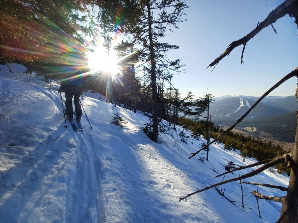 Jerryho výstup na Černou horu aneb kouzlo svítání, 28.3., začal páteční rekognoskací terénu, abychom v sobotu minimálně sundávali lyže. Bavilo mě to, počasí přálo, díky Blahoslavovi jsem si užil i kotvu. A požil zasloužené pivečko z Malé Úpy.