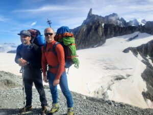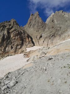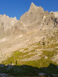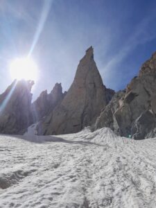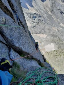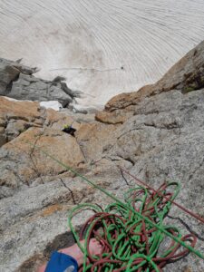 Pátek jdeme na Aig. Du Peigne – Upper Face (3 192m). Nástup žlabem, poté komínem… NC za 4, popolézání v pohorách, solo s několika boulderovými místy kde stavíme a dojišťujeme. Pak trochu bloudíme mezi věžičkami. Nakonec stojíme pod cestou NW Pilier od mistra Rebufata. Nástupový štand není, další tušíme… v cestě je vlastně asi jen jediný nýt (20m pod vrcholem) a jinak jen štandy, místy pochybné kvality.. dvě provázané skobky, nebo letitá smyce pod šutrem… takže zážitek. Gaidici s klienty šli lehčí cesty, tak je vidíme jen zmizet z vrcholu. Slaňujeme, alespoň myslíme v jejich stopách, ale po 4 slaněních není uplně jasno kam…tak bloudění, hledání, nalézání se a opět ztrácení.. Trochu zápek. Nakonec s shledáváme s pohorkami a valíme dolů….u stanu ručička ukazuje 14hodin na cestě.