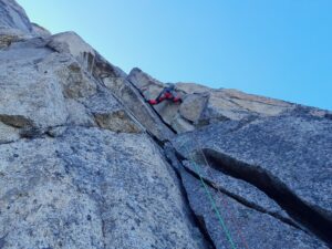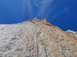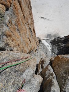 Nastupujeme prostředkem, natraverzujeme doleva nad sníh a valíme rozbitých terénem na rampu. Trochu hledáme a nakonec nalézáme správnou trasu. Spáry, spáry, koutek, rajbas, spáry, spáry, spáry. 6b+ tahá Cíba, jde víc v pravo, než měl, tak ještě přidává na obtíži…. V horní části se napojujeme do O sole Mio, jako většina. Tím vynecháváme hákovací délku a valíme fingerlocky a poté širočinou nahoru. Pak již to zlehkne. „Za chvilku“ není kam stoupat….. Výhled jako z vrtule. Slaníme po cestě a „za chvilku“ jsme u stanu. Celkem cca 11 hodin zážitků. Ještě se vracím pro lano, které jsme v opojení nechali v posledním slanění na ledovec….