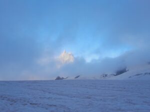 Na ledovci je vedro k padnutí. Výška, nedostatek spánku a těžká krysa se projevuje… Stan stavíme na dosah ke kopcům. Jdeme se mrkout na nástup. Holky, které právě slaňují nám poradí, kudy šly nástup Swis Route. Originál po sněhu neexistuje. Spokojení jdeme ke stanu, uvaříme a za světla uleháme. Pro dnešek stačilo. Posloucháme kamenné laviny, vlastně celou noc.