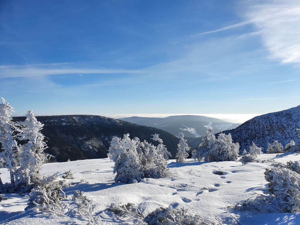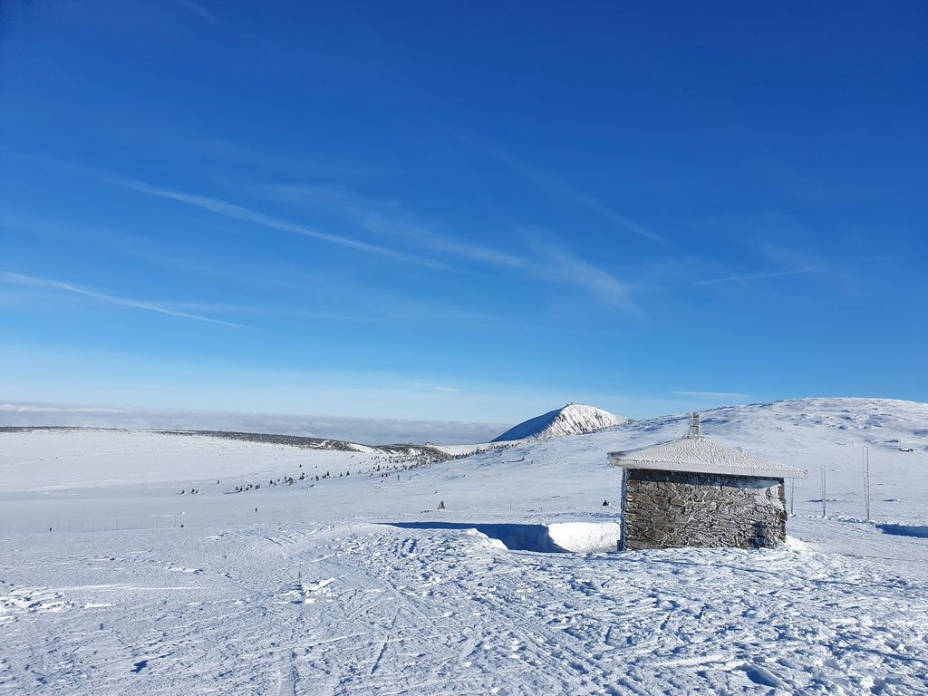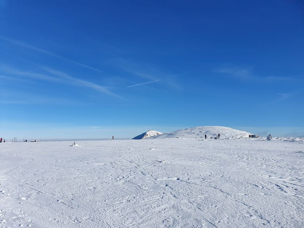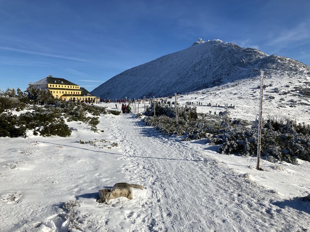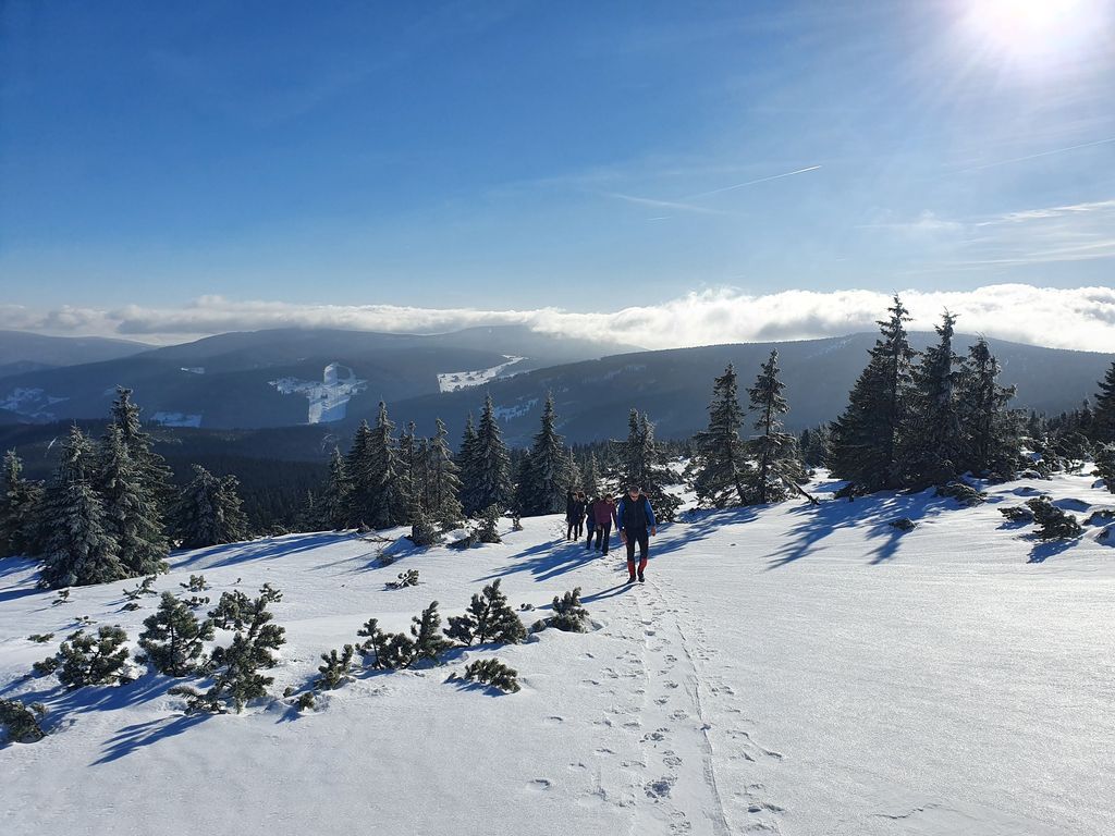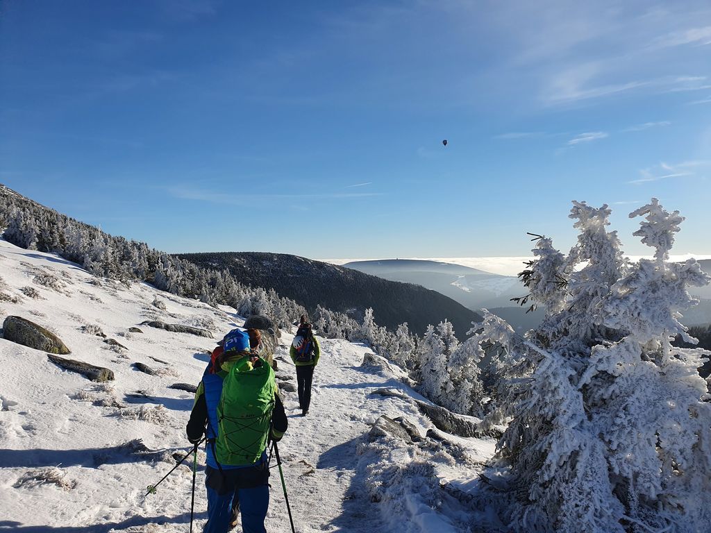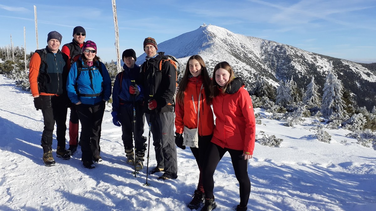 Zbytek volí pěškobus. Trasa přes Modrák kolem Studny pod Sněžku. Víme, že nám z Pomezek přes Sněžku jde organizátorka Adélka. A u Slezského vylezou i kluci. Počasí je luxusní, teplo místy na tričko. Na Luční pivečko (udělali tam bufetový systém obsluhy, což výrazně zlepšilo rychlost).
