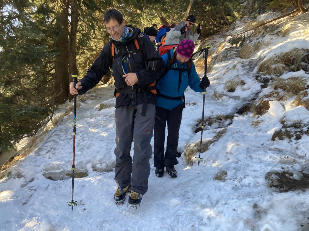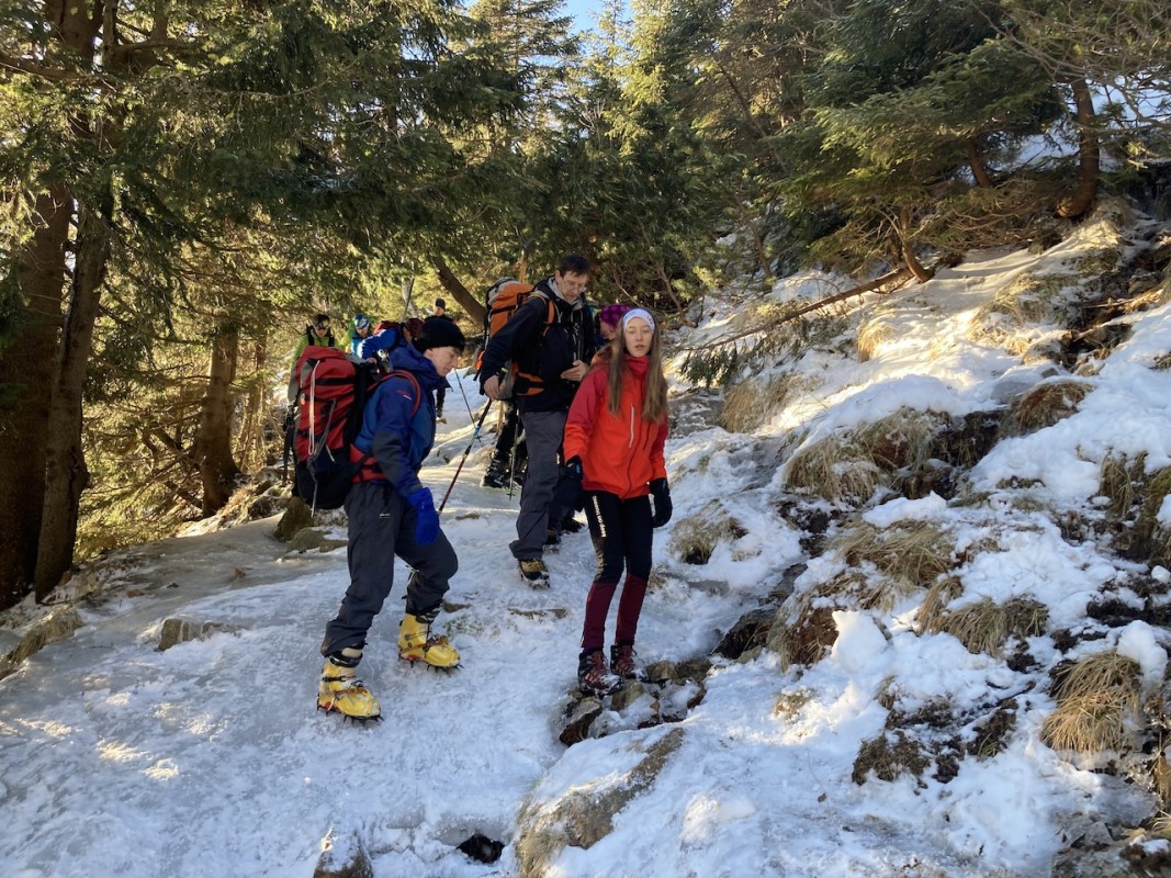 Pokračujeme dále a skoro v jeden okamžik se potkáváme všichni kousek od Slezského domu. Při sestupu využíváme gentlemanství mladého Fandy a Pekyho. Jejich železa nám zachránila život a úsměv na rtu. Nad trkačem i pod pěkná ledová dráha.