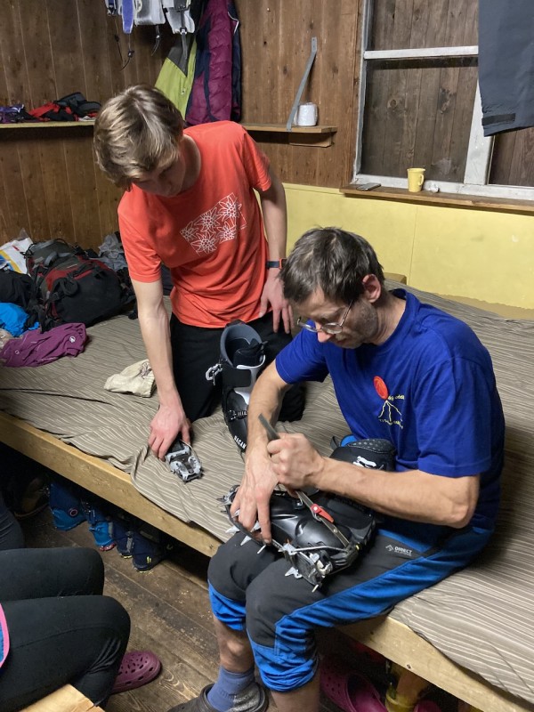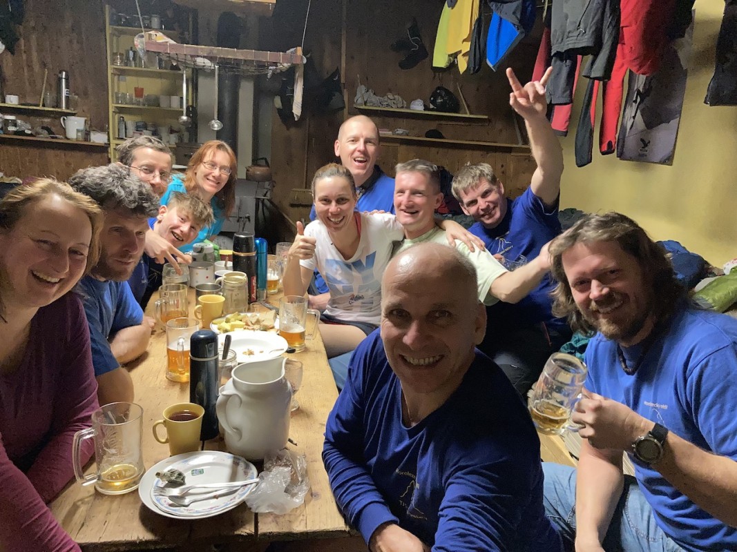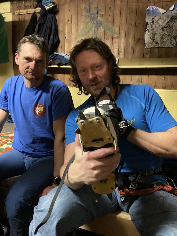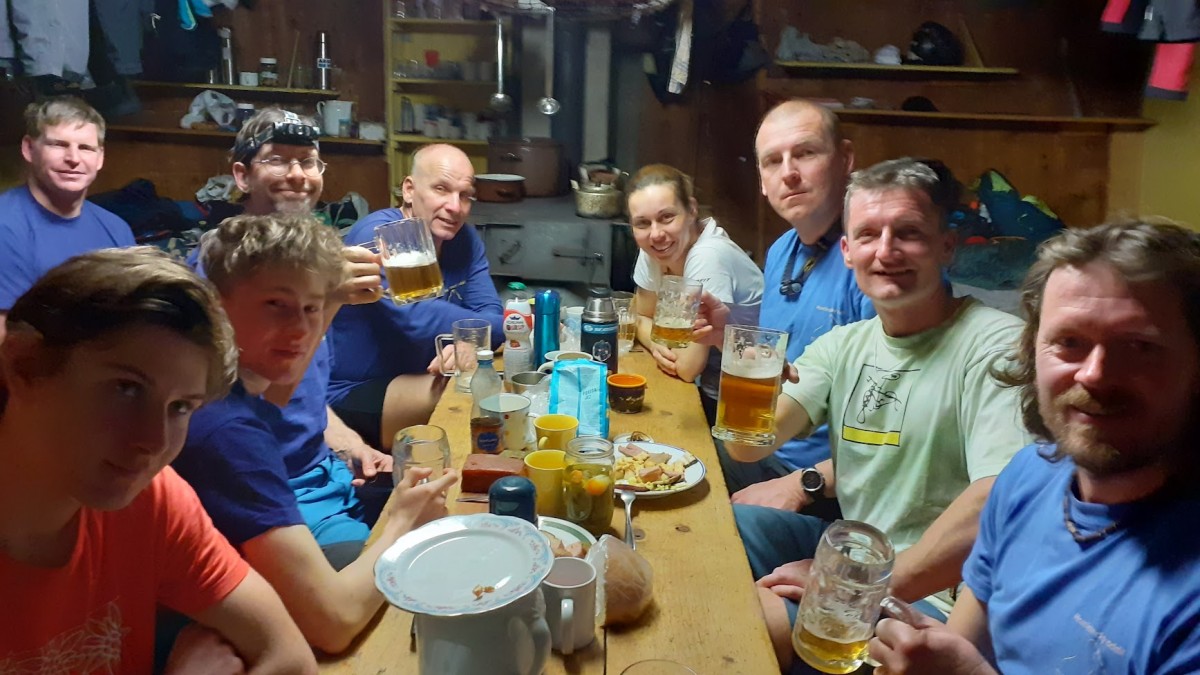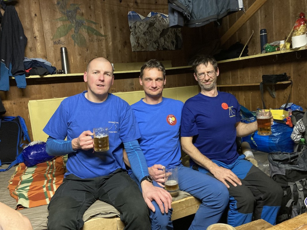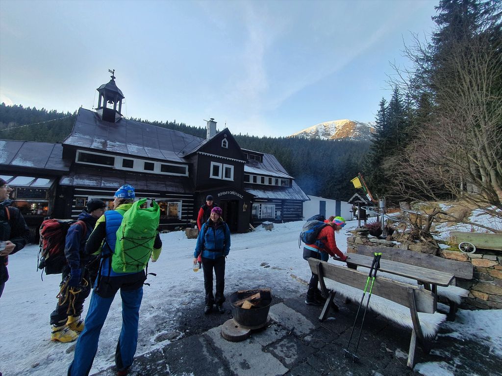 Zábava plyne, bavíme se o všem možném a hlavně co s tím sněhem a co podniknem, když jsem vzal aj výbavu. Pekyjovci to mají jasné, ty to nevzali. Mají ale motyčky a pánská sekce chce ráno v 7 vyrazit na ledy. Bořek měl jít s Márou, kterého ale stihla rýmička a přijde možná zítra. Po chvilce mudrování vytahuje Bořek Márovy mačky a nechají se kolovat. Nakonec padnou jen na Liborovy skelety. Parťák nalezen.