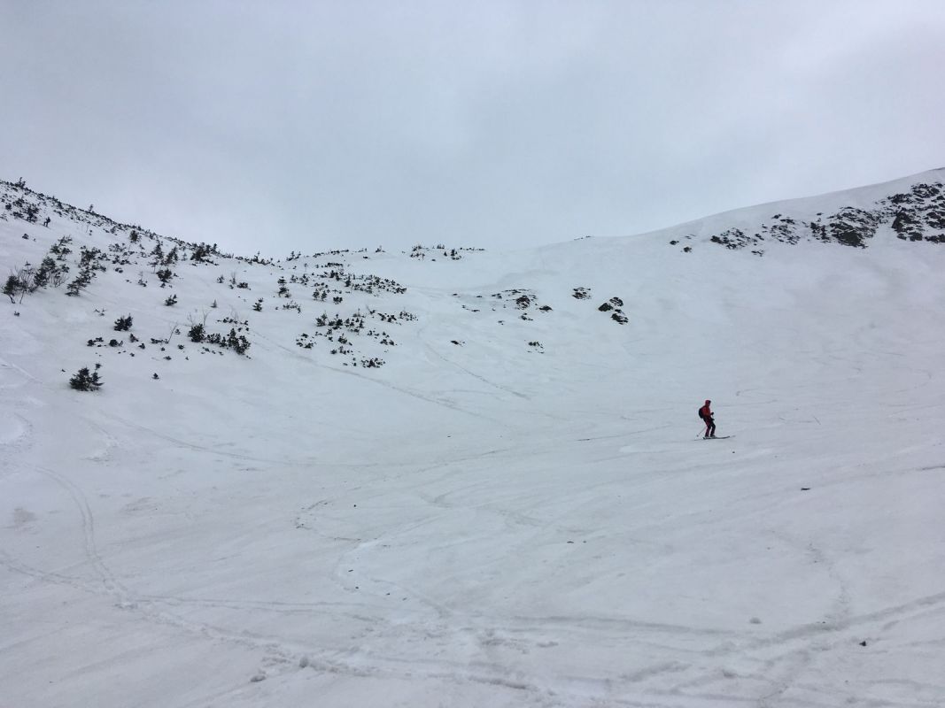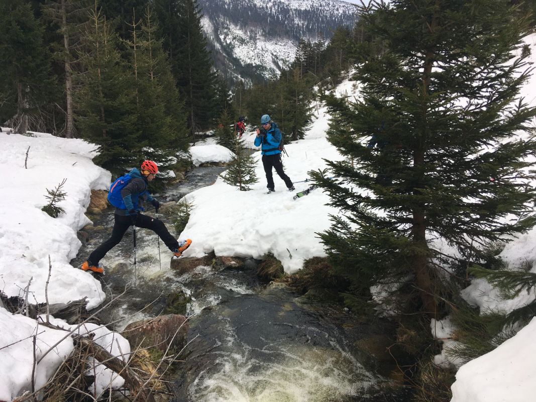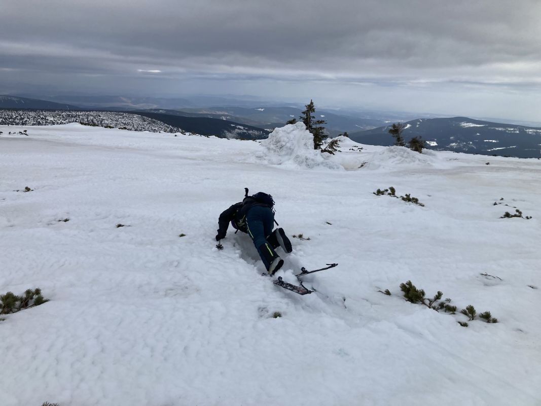 Kolem 10h vycházíme na neskutečně úžasný výlet po cestách necestách, dnes hodně nového pro mnohé z nás – Modrák, sjezd za Děvínem k Modrému potoku pěkně do díry, protějším svahem na Výrovku (oběd), Luční hora, sjezd Pramenným dolem, po Železném hřbetu pěkně nahoru zpět na Luční. Co dál? Padá rozhodnutí na Májový sjezd. Podmínky jsou, chuť také. Já trochu obavy, ale podpora je veliká, tak se frčí. A ono to frčí 😊. Asi díky Márově polibku matičky země 😊.