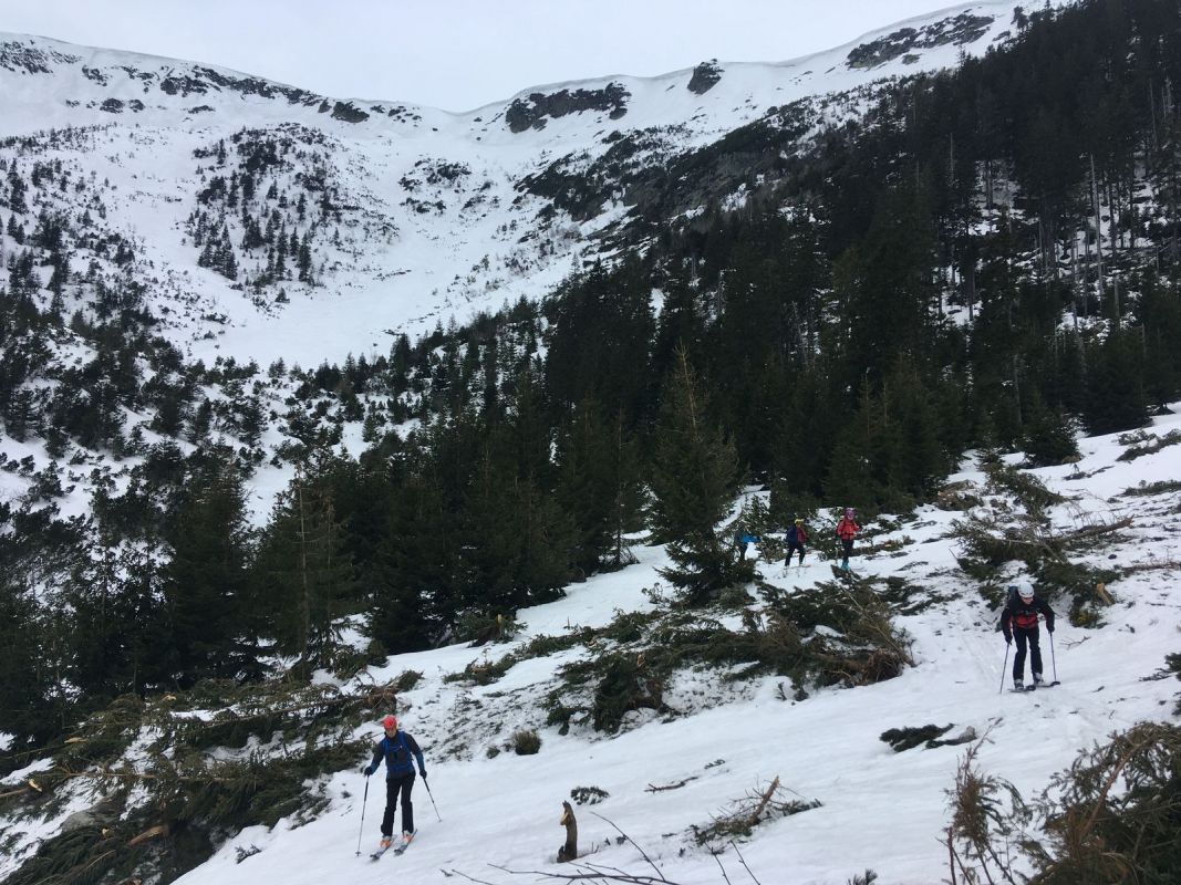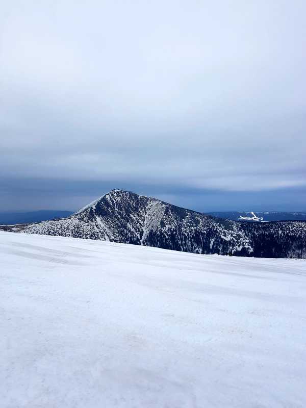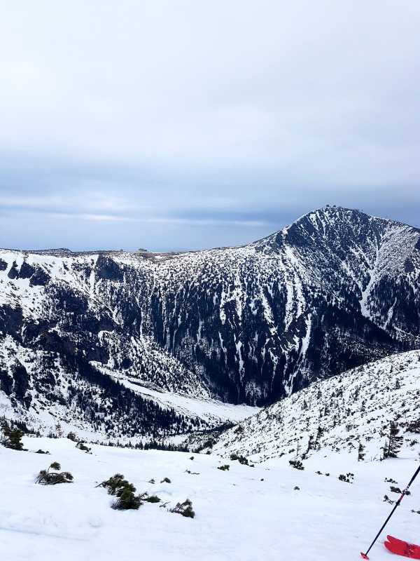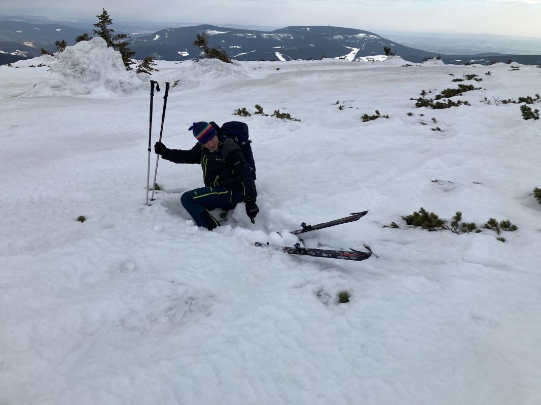 František nám opět odchází po své ose pryč. My máme pohodové ráno. Na zmrzlý sníh nemá cenu spěchat, dáváme sluníčku trochu času, aby se rozkoukalo. Směřujeme směr Výrovka, já s Jírou přímo, Máňa s Maruškou přes Luční horu, chlapi ještě Pramenným dolem. A cestou zpět ještě pár hezkých obloučků na svahu Studni, níž už jsou na loukách hodně vytáté fleky 😊.