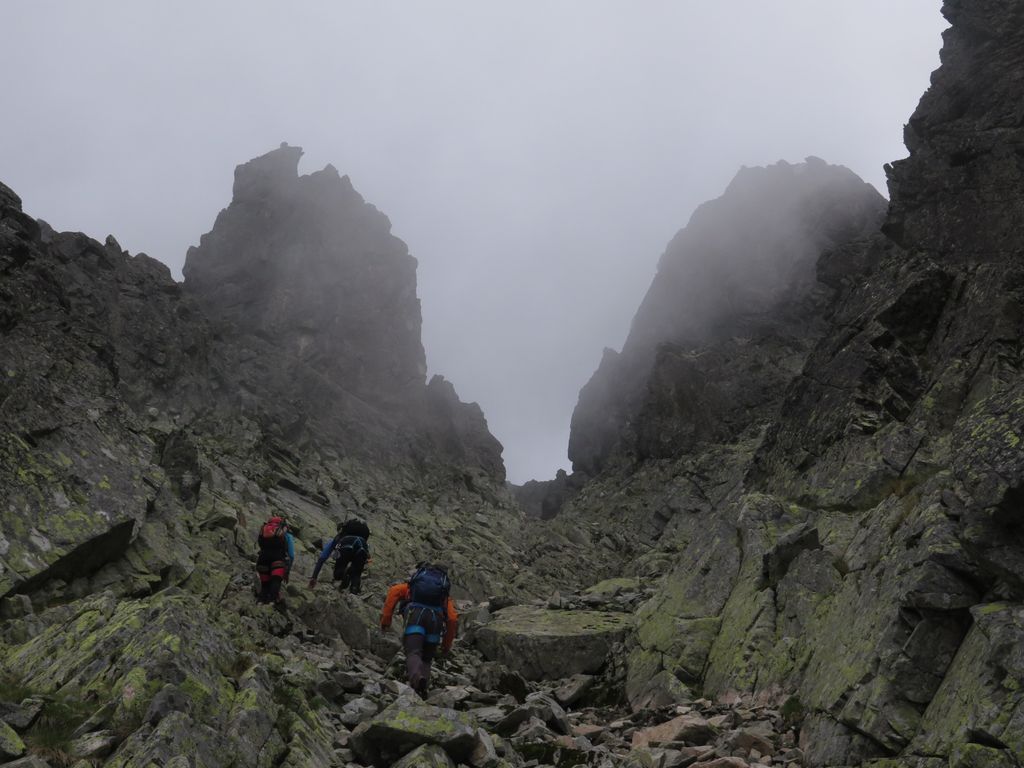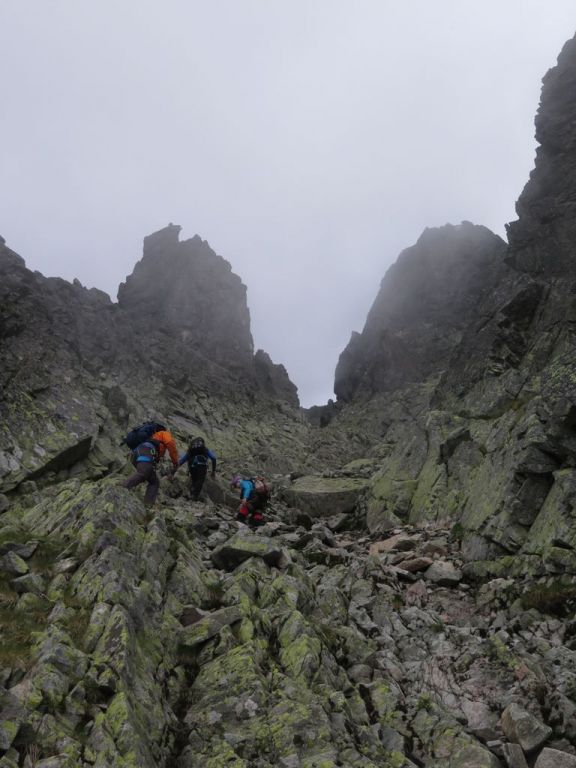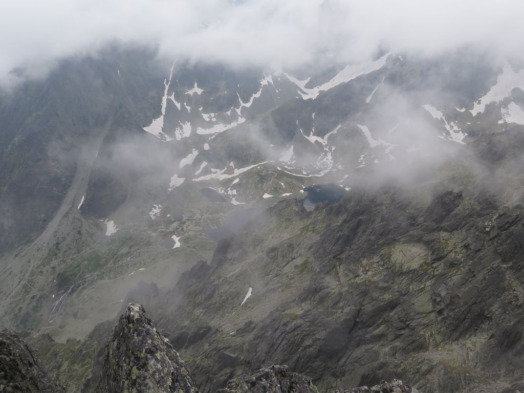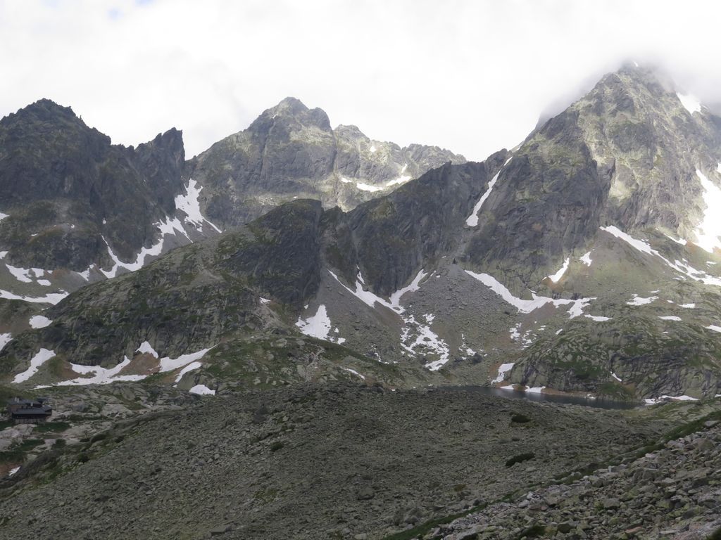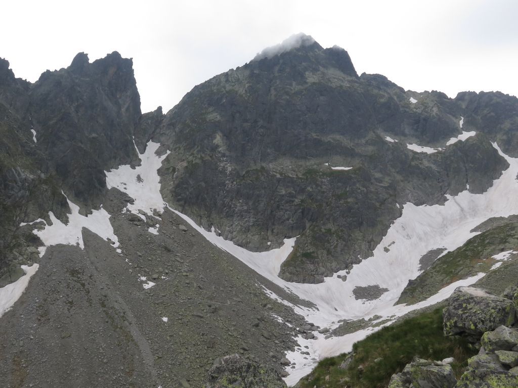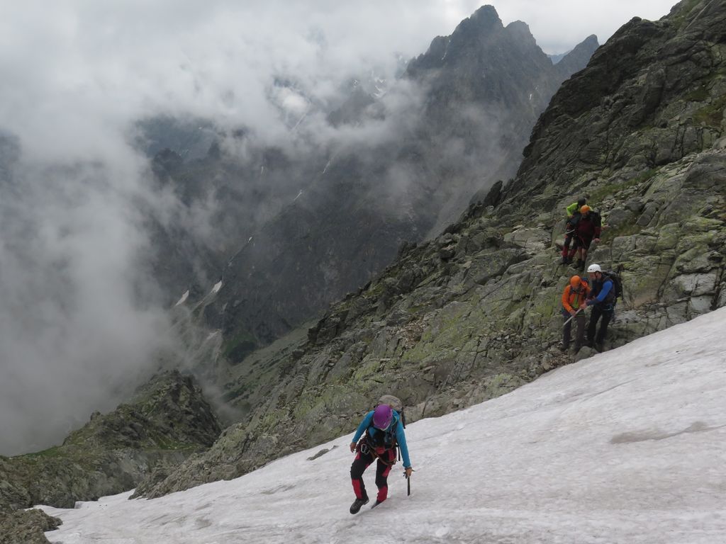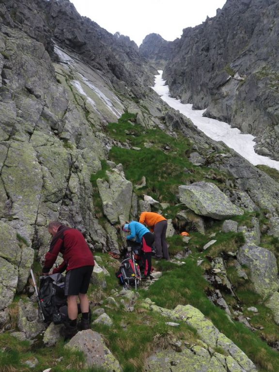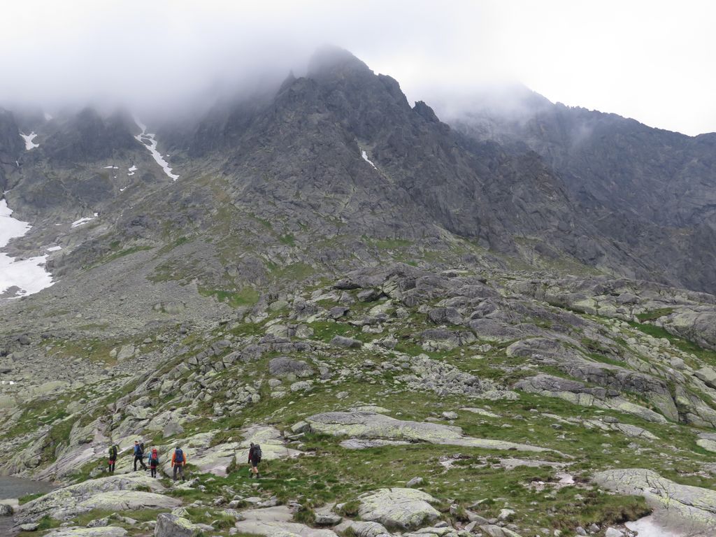 V neděli ráno, 4.7., vstáváme a balíme na výstup. Tedy ne všichni, většina děvčat a junior se chystají na kolečko – Terryna, Priečne sedlo, Zbojanda, Hrebienok a chata. Fotky z tohoto výletu nemám, ale užili si to a měli to na celý den. I Jana, kterou odradily řetězy a náročný výstup do sedla, si neděli příjemně užila v celé Malé Studené dolině. My tedy opět šlapeme na Terrynu a věříme když ne v hezké, alespoň v nedeštivé počasí. Část vyrazila dříve, scházíme se na Terryně. Nakonec i se skupinou A, tak ještě jedno veselé loučení. Cestou koukáme na naši cestu žlabem, vysněženou Jordánku. A v mracích tušíme vrchol Lomničáku.