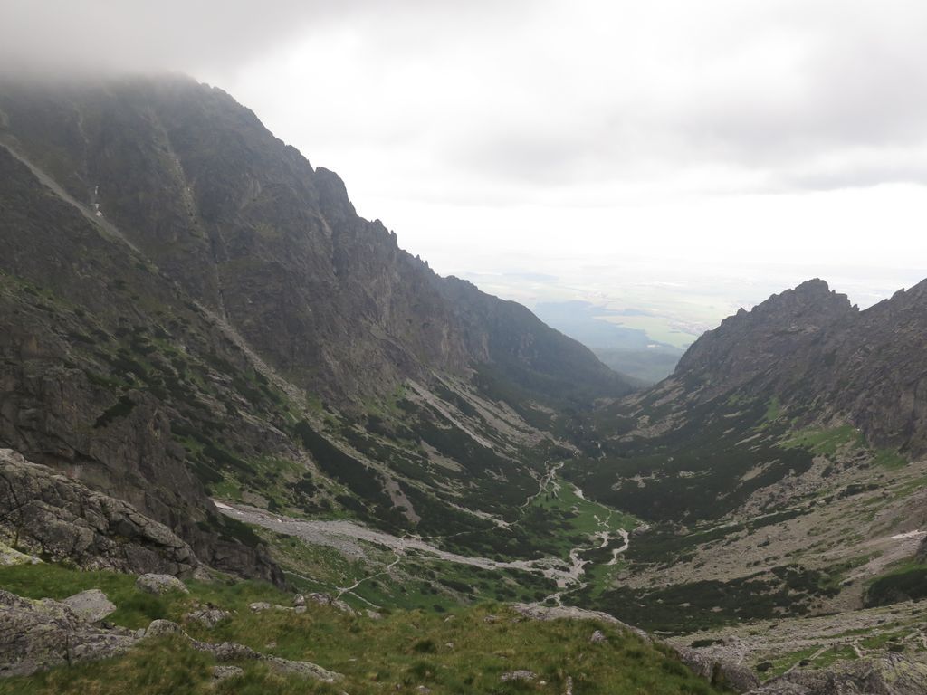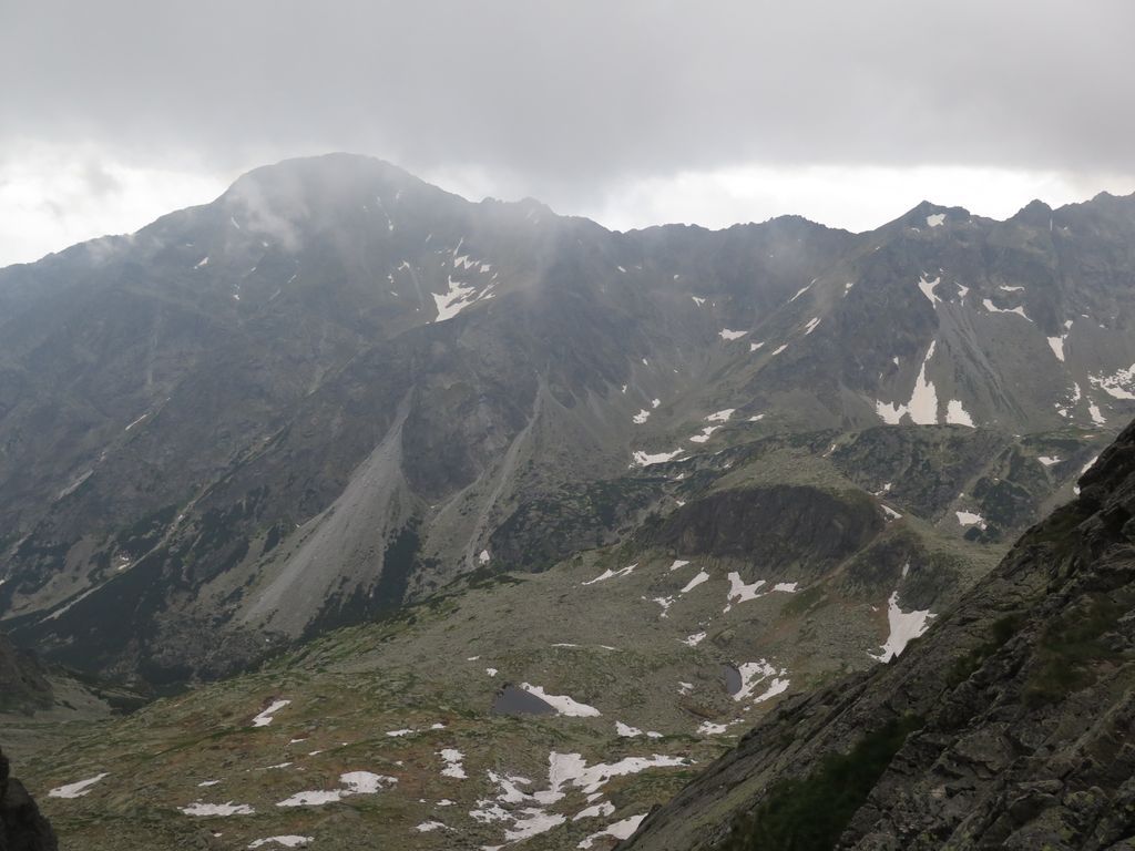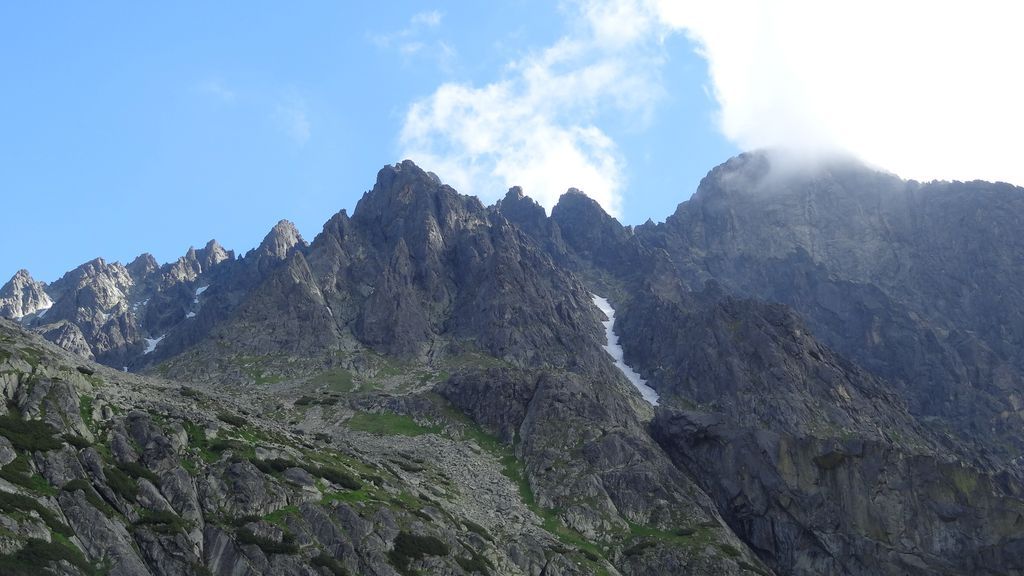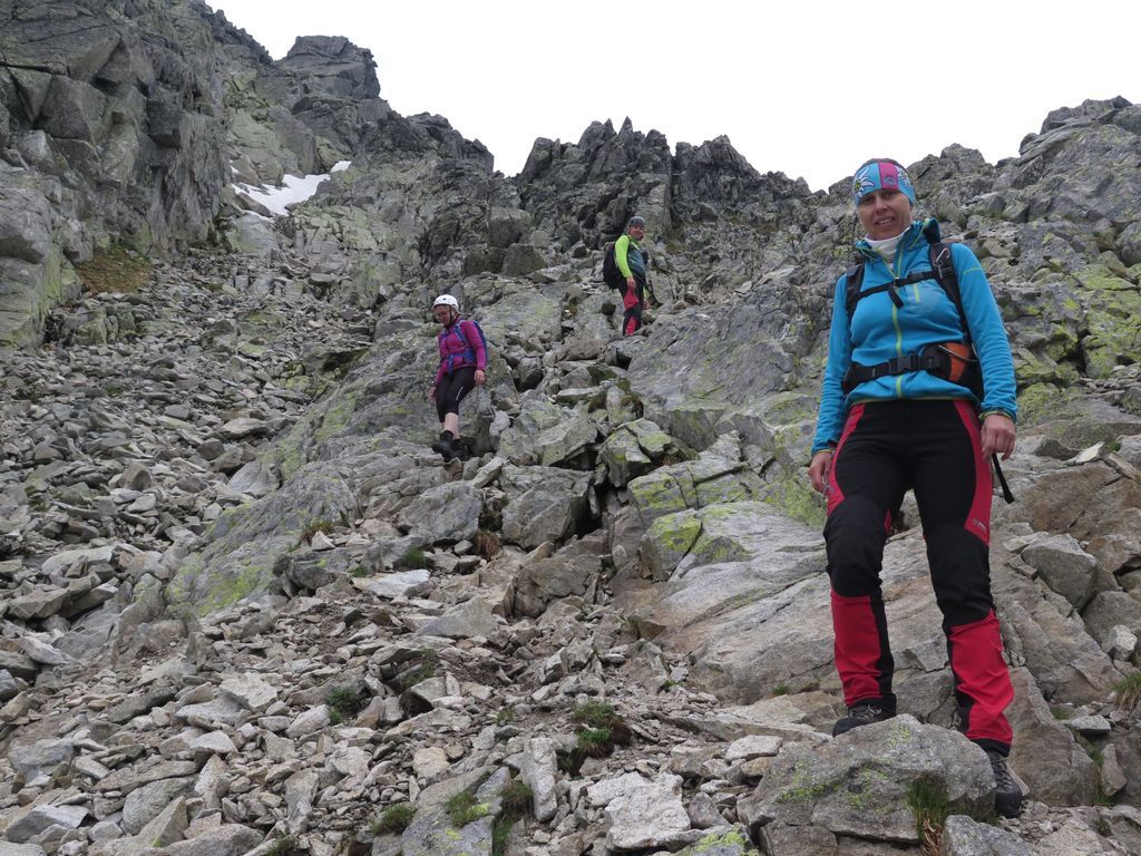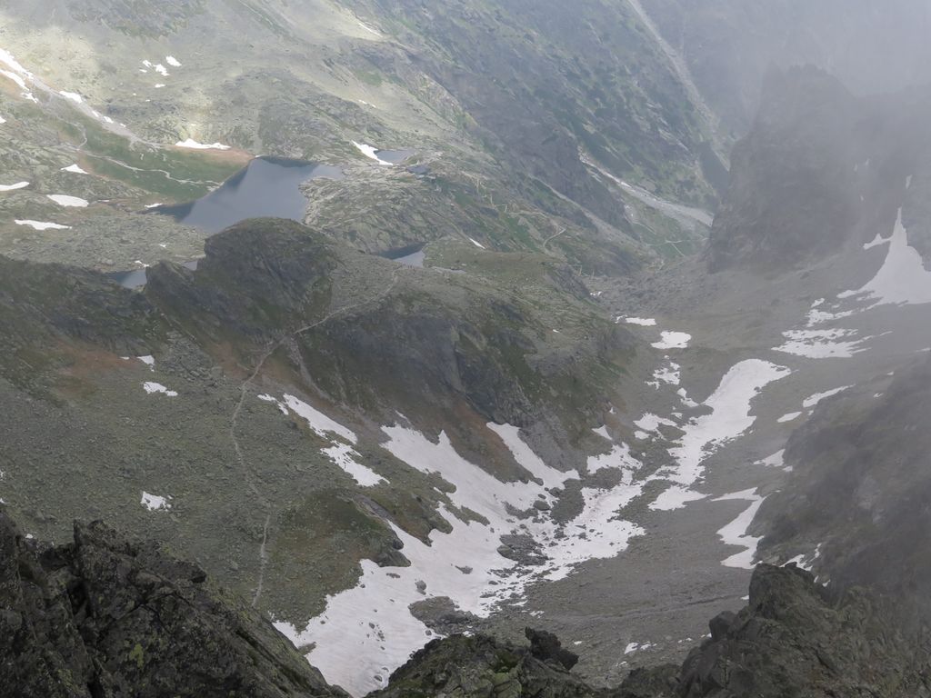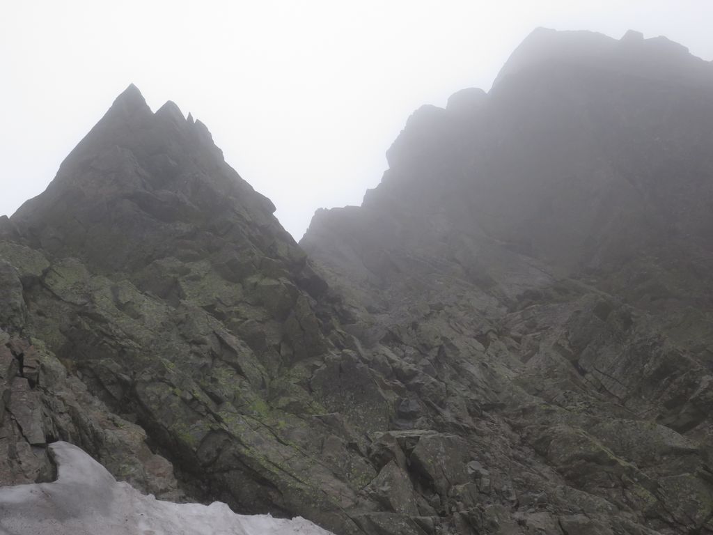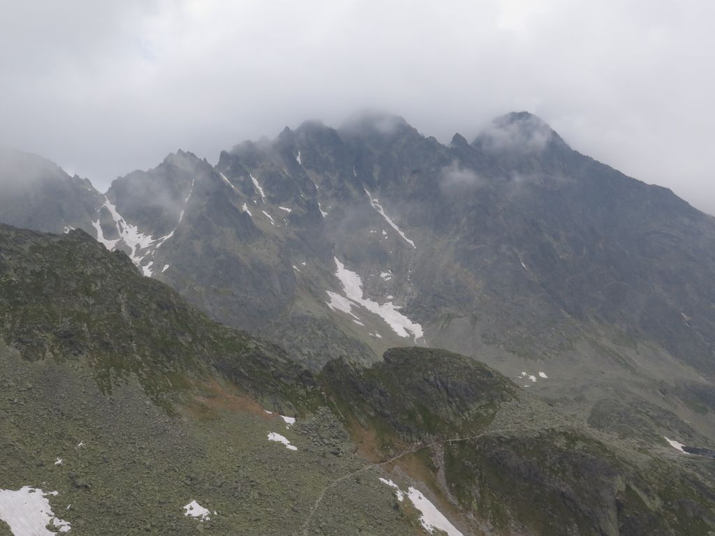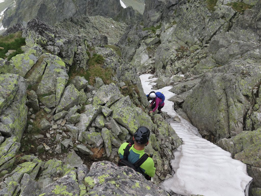 V neděli ráno, 4.7., vstáváme a balíme na výstup. Tedy ne všichni, většina děvčat a junior se chystají na kolečko – Terryna, Priečne sedlo, Zbojanda, Hrebienok a chata. Fotky z tohoto výletu nemám, ale užili si to a měli to na celý den. I Jana, kterou odradily řetězy a náročný výstup do sedla, si neděli příjemně užila v celé Malé Studené dolině. My tedy opět šlapeme na Terrynu a věříme když ne v hezké, alespoň v nedeštivé počasí. Část vyrazila dříve, scházíme se na Terryně. Nakonec i se skupinou A, tak ještě jedno veselé loučení. Cestou koukáme na naši cestu žlabem, vysněženou Jordánku. A v mracích tušíme vrchol Lomničáku.
