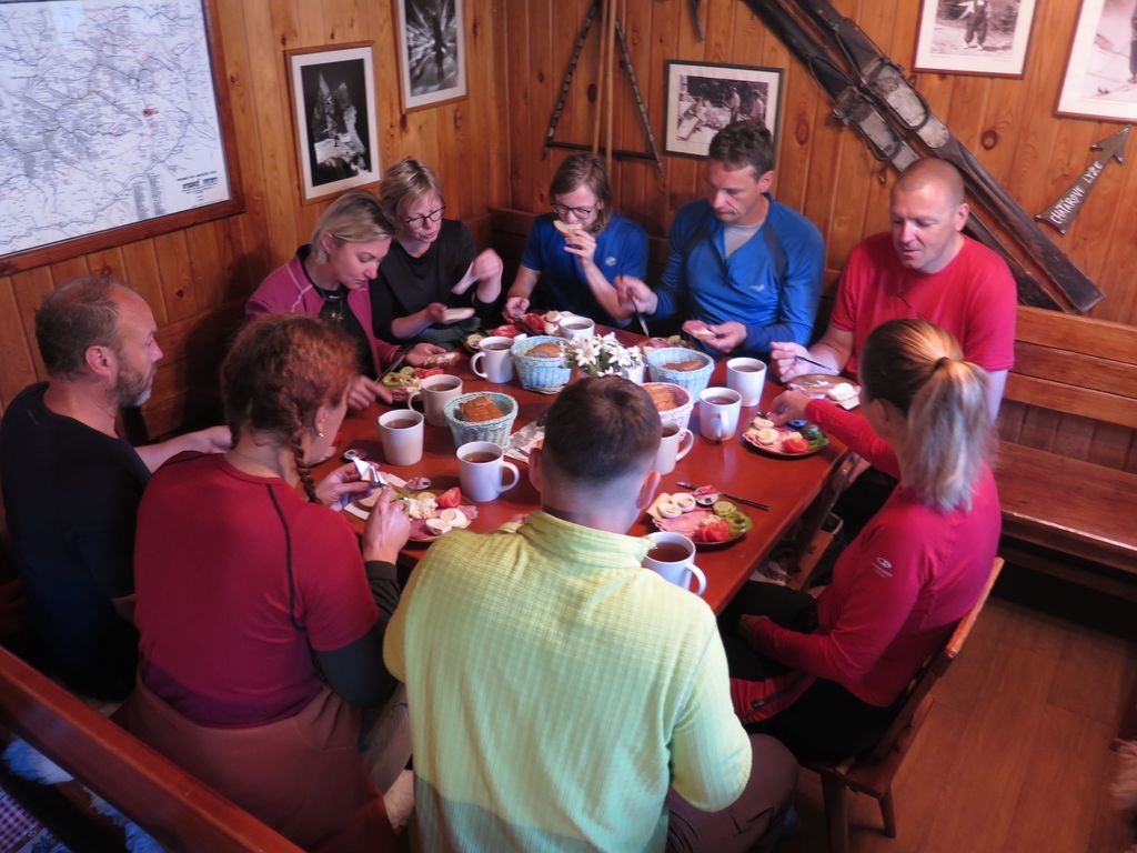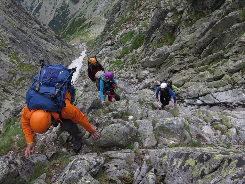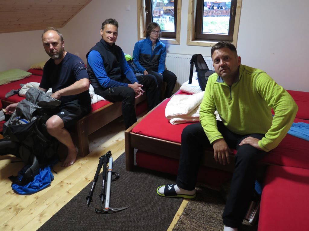 Pro zaneprázdněnost obsluhy odkládáme ubytování a bágly, nalehko vyrážíme směr Terryho chata, podívat se, kudy vedou vybrané lezecké cesty pro následující dny – Lomničák tzv. Jordánkou a Pyšný štít nějakou hezkou trojkou. Užili jsme si pěkné odpoledne, i s vrtulníkem pro pochroumané koleno. Následovalo ubytování zvlášť ženy (na chatě) a muži, první poklidný společný večer.