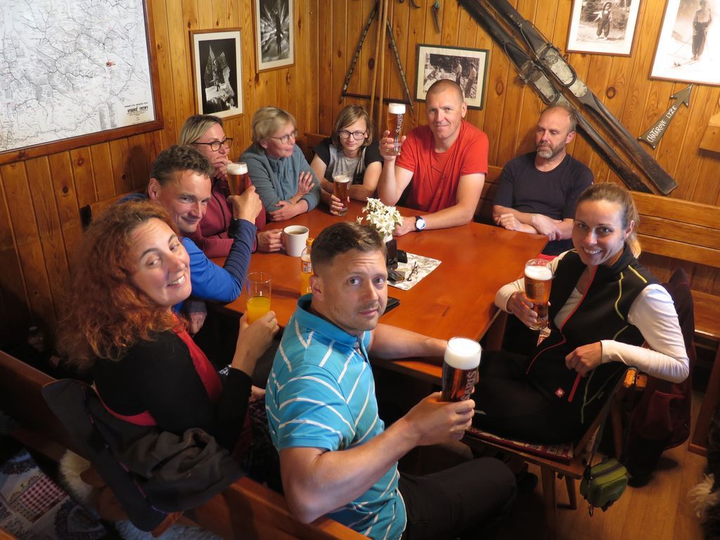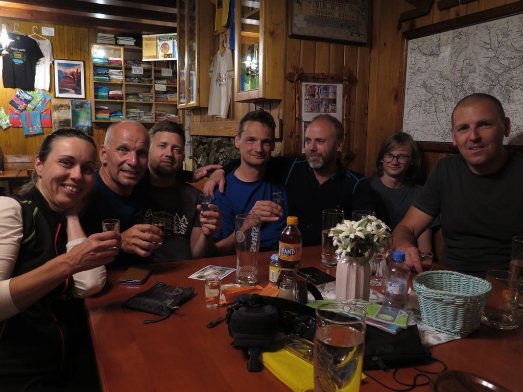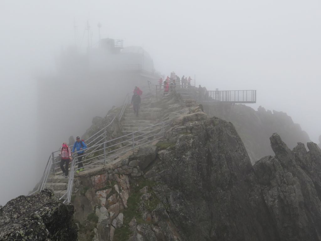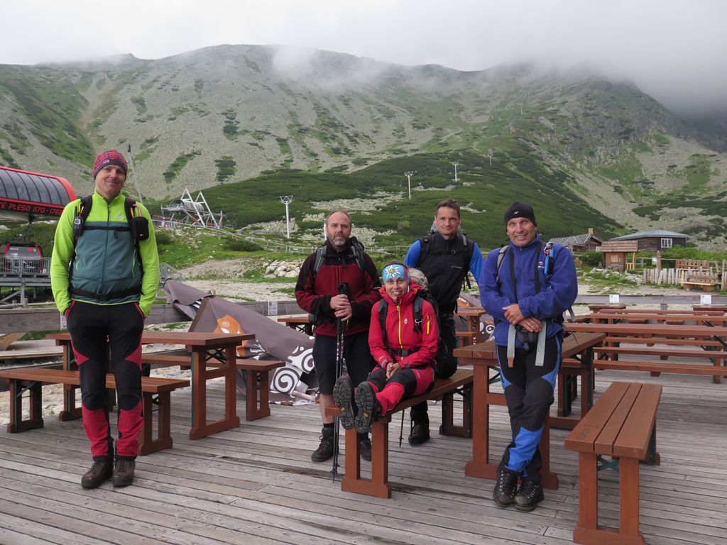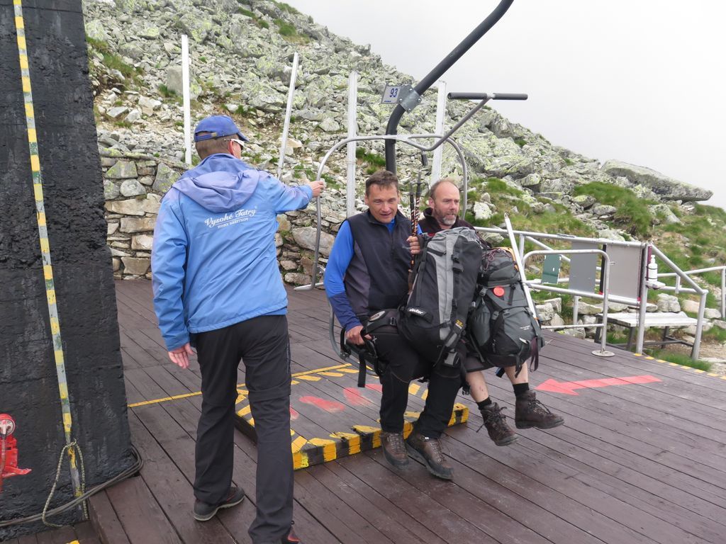 Po půl hodině odcházíme, má brzy začít pršet. Sestup byl naštěstí suchou nohou, klasikou směr Skalnaté pleso. V Lomnickém sedle vidíme v provozu lanovku, obsluha nás zadarmo ráda sveze dolů. To je úleva!!! Je čas na jedno a pak tradá na chatu na večeři. Přicházíme v 18:45. Sprcha a navléct se do voňavého, přivítat se s ostatními, začít si užívat vrcholový večer.