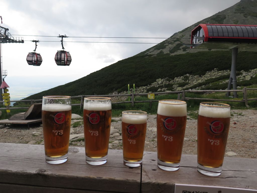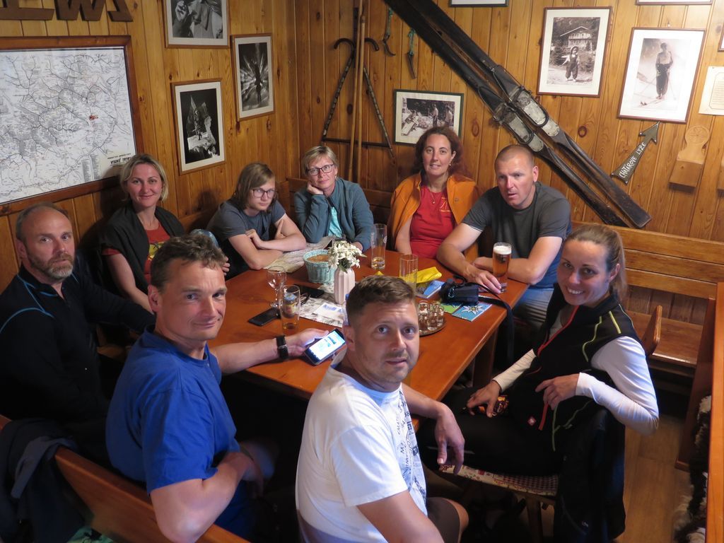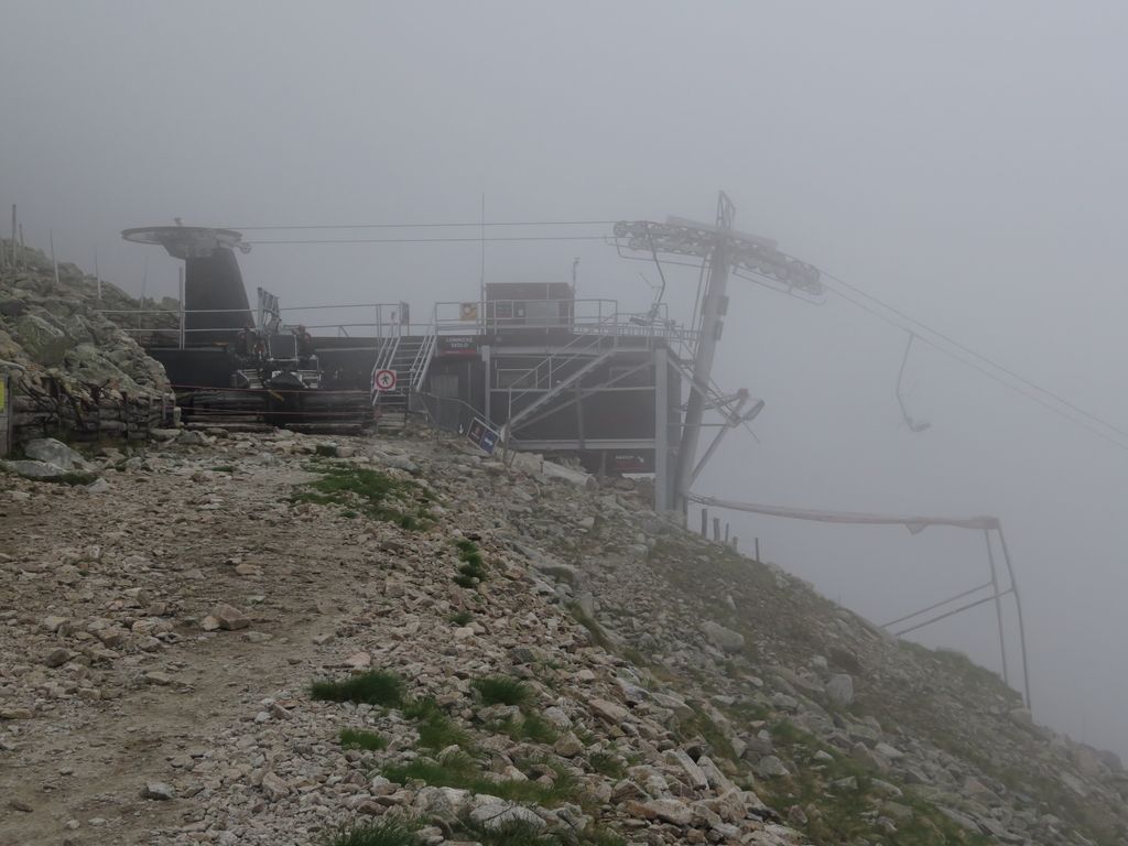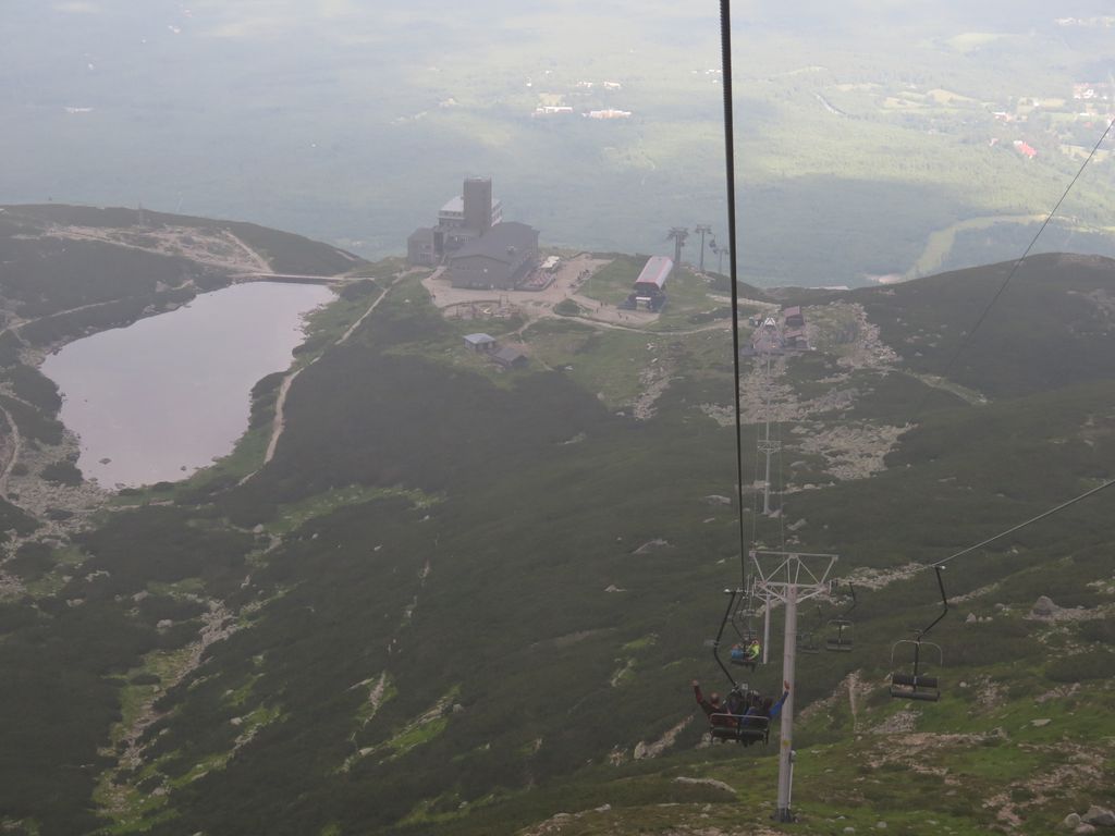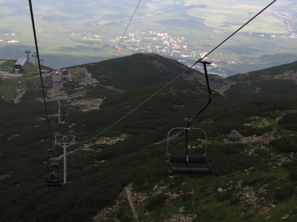 Po půl hodině odcházíme, má brzy začít pršet. Sestup byl naštěstí suchou nohou, klasikou směr Skalnaté pleso. V Lomnickém sedle vidíme v provozu lanovku, obsluha nás zadarmo ráda sveze dolů. To je úleva!!! Je čas na jedno a pak tradá na chatu na večeři. Přicházíme v 18:45. Sprcha a navléct se do voňavého, přivítat se s ostatními, začít si užívat vrcholový večer.