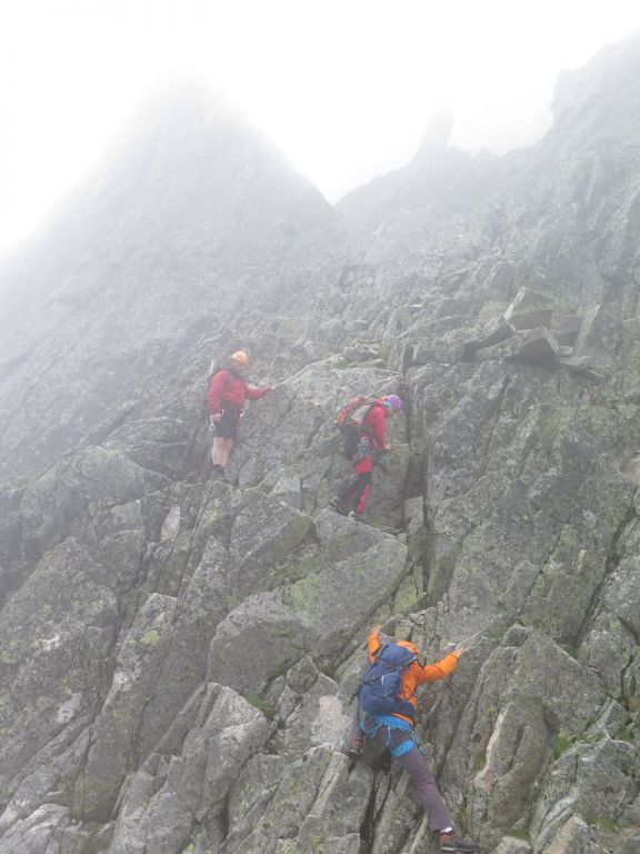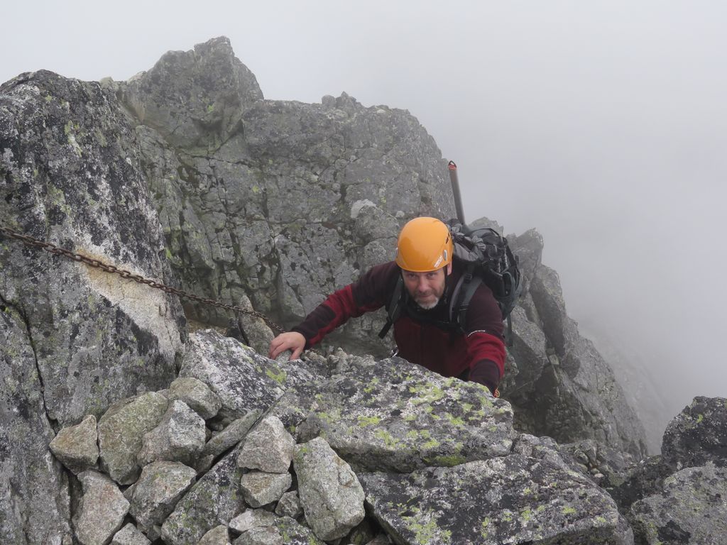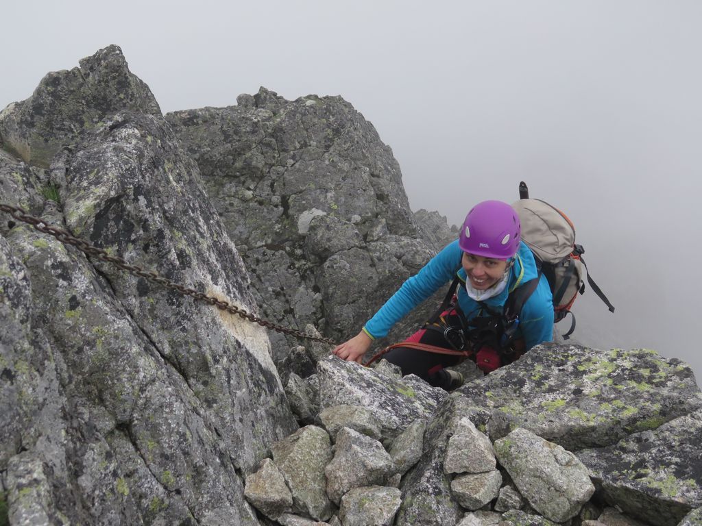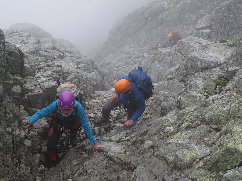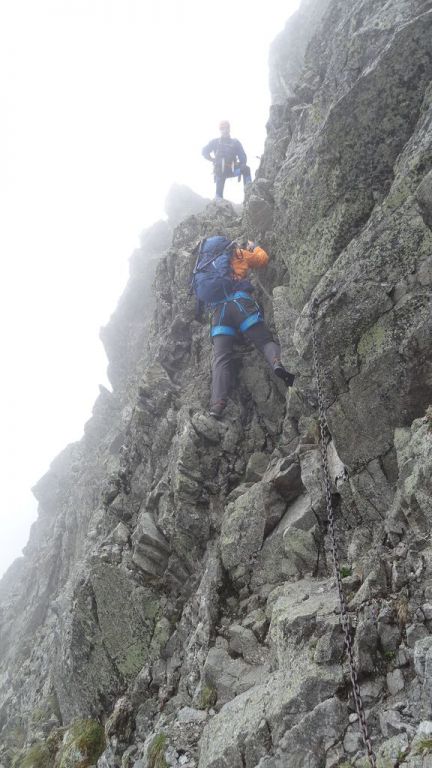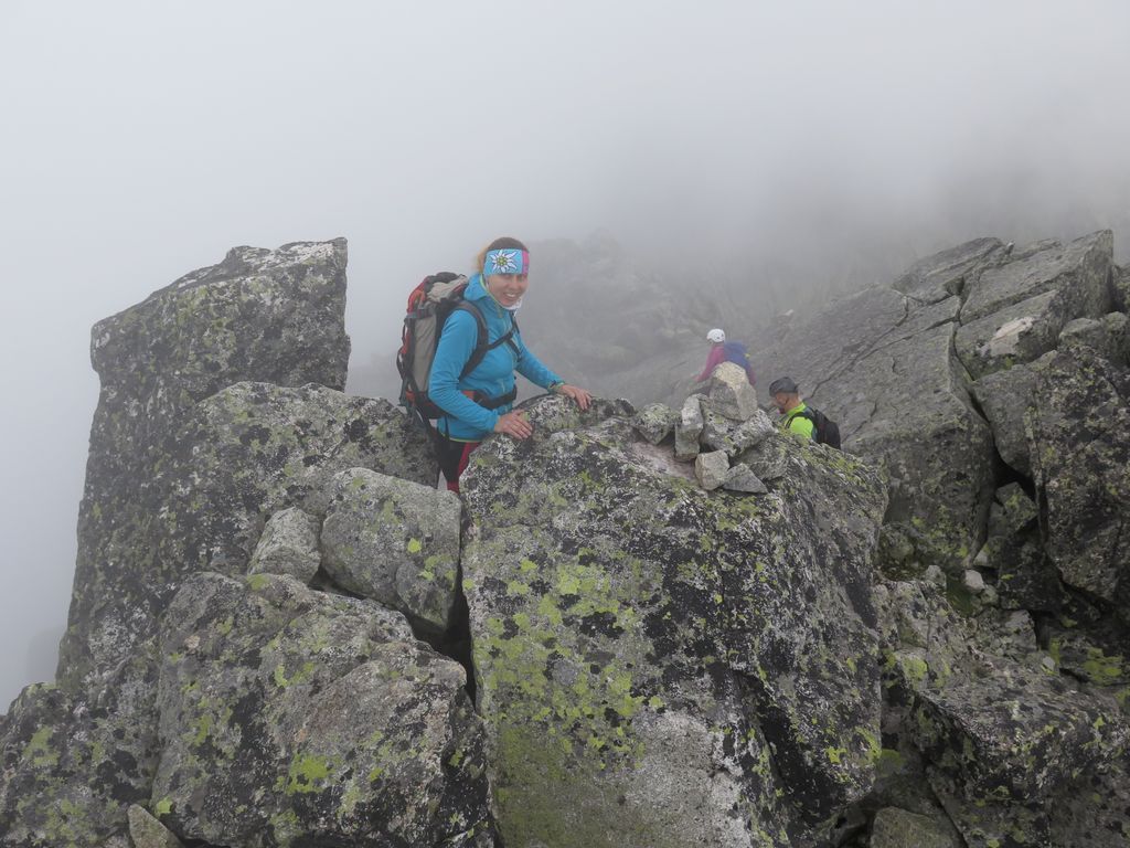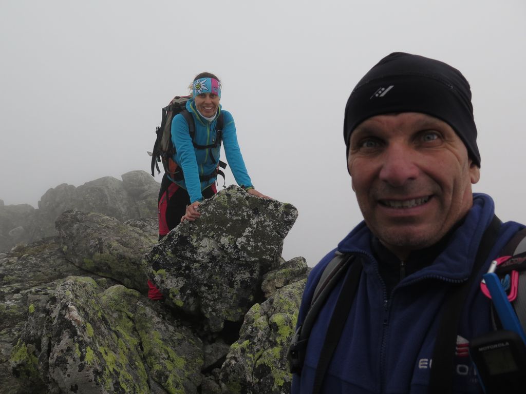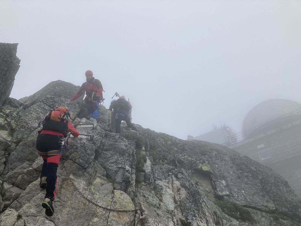 Marcel s Jířou jsou již nějaký čas vpředu, nováčci potřebují více péče, ale jsou výborní! Zkušená Ade rozdává morál, Šíma překvapuje přehledem a pohodou, Káčko je každým metrem jistější – skvělá skupina. Po doplnění energie a tekutin vyrážíme vstříc poslednímu úseku s občasnými řetězy, které místy zdatně (nechtěně) vynecháváme a jdeme svoji cestou. Já nadšený, neb je lezecká, zbytek ani nedutá, leč stoupá bravurně. Co jim také zbývá… Viditelnost spíše minimální. 15:00 vrchol.