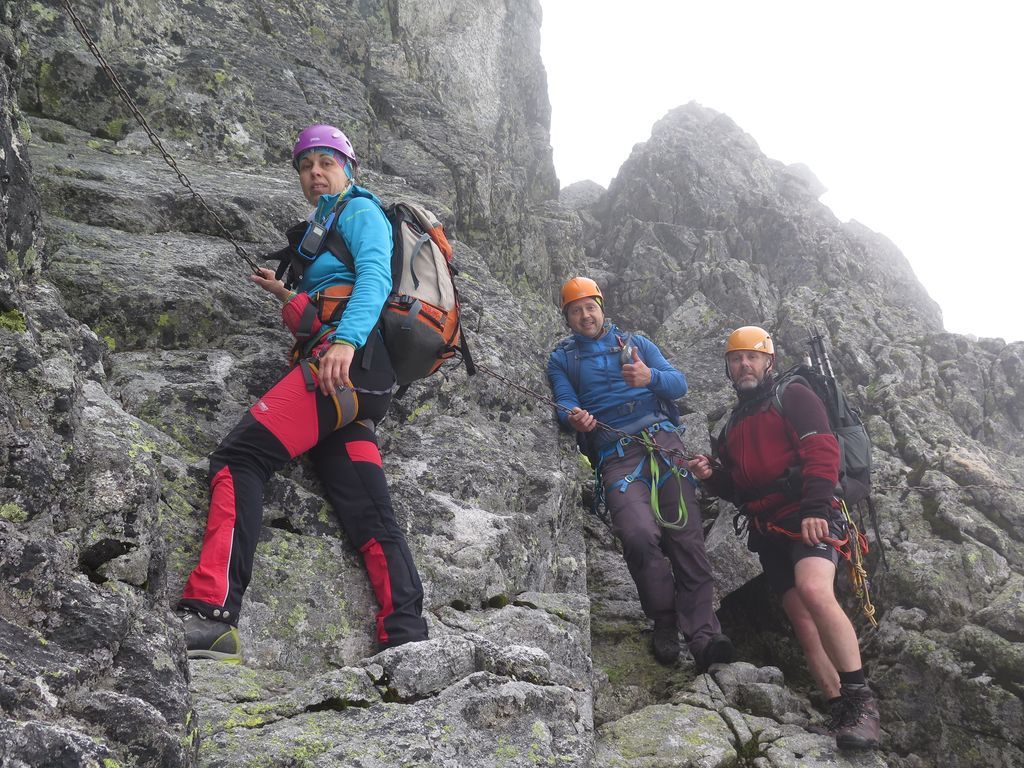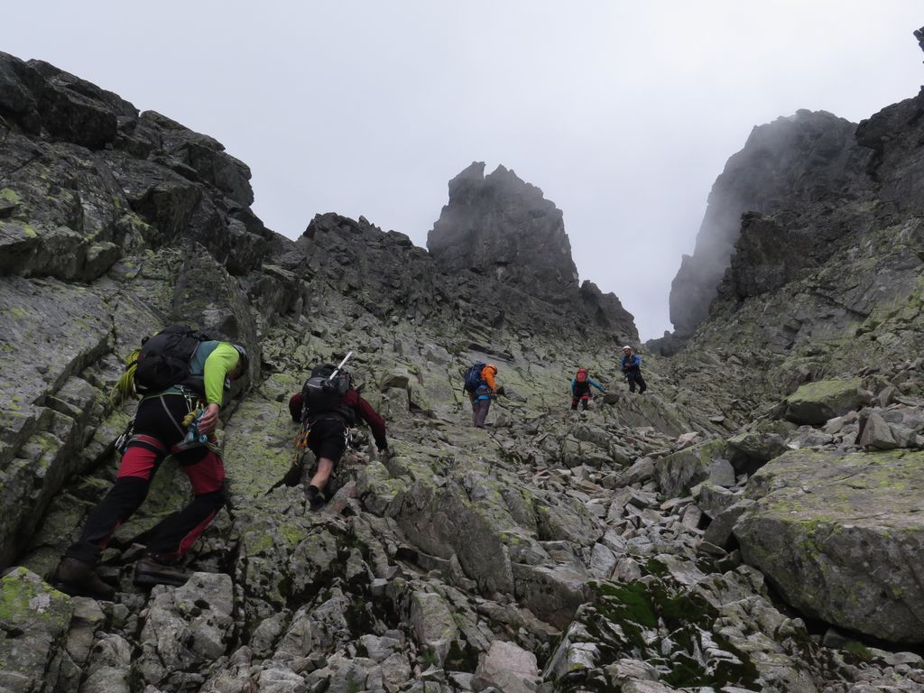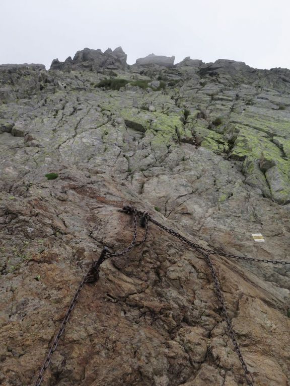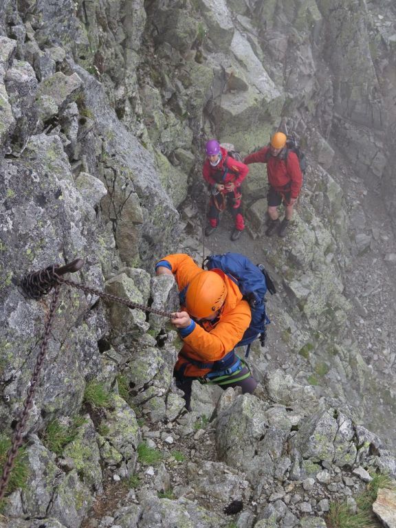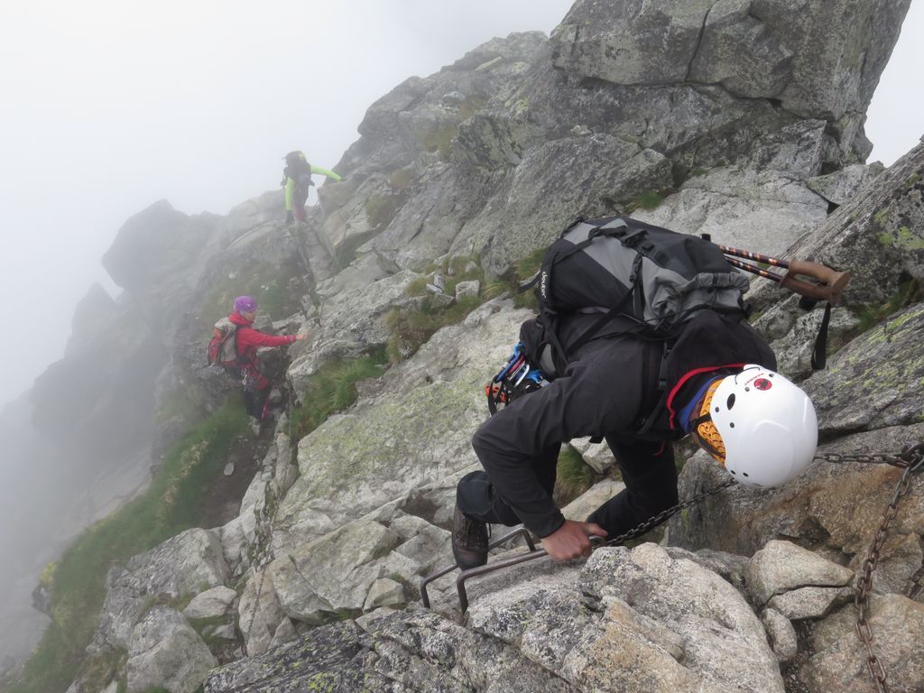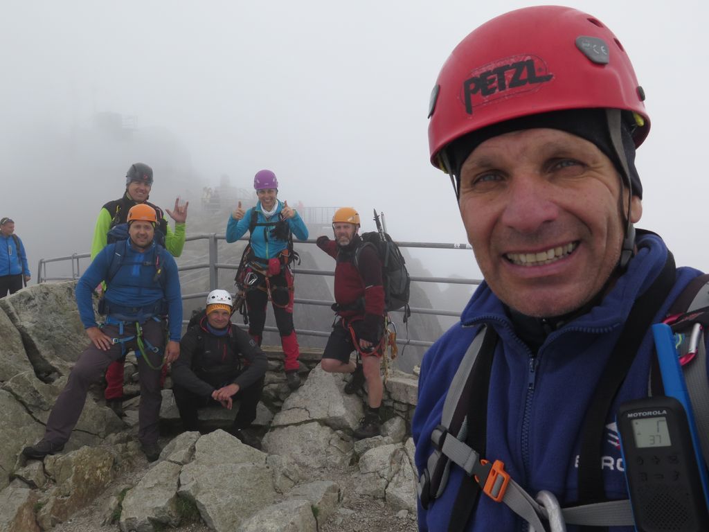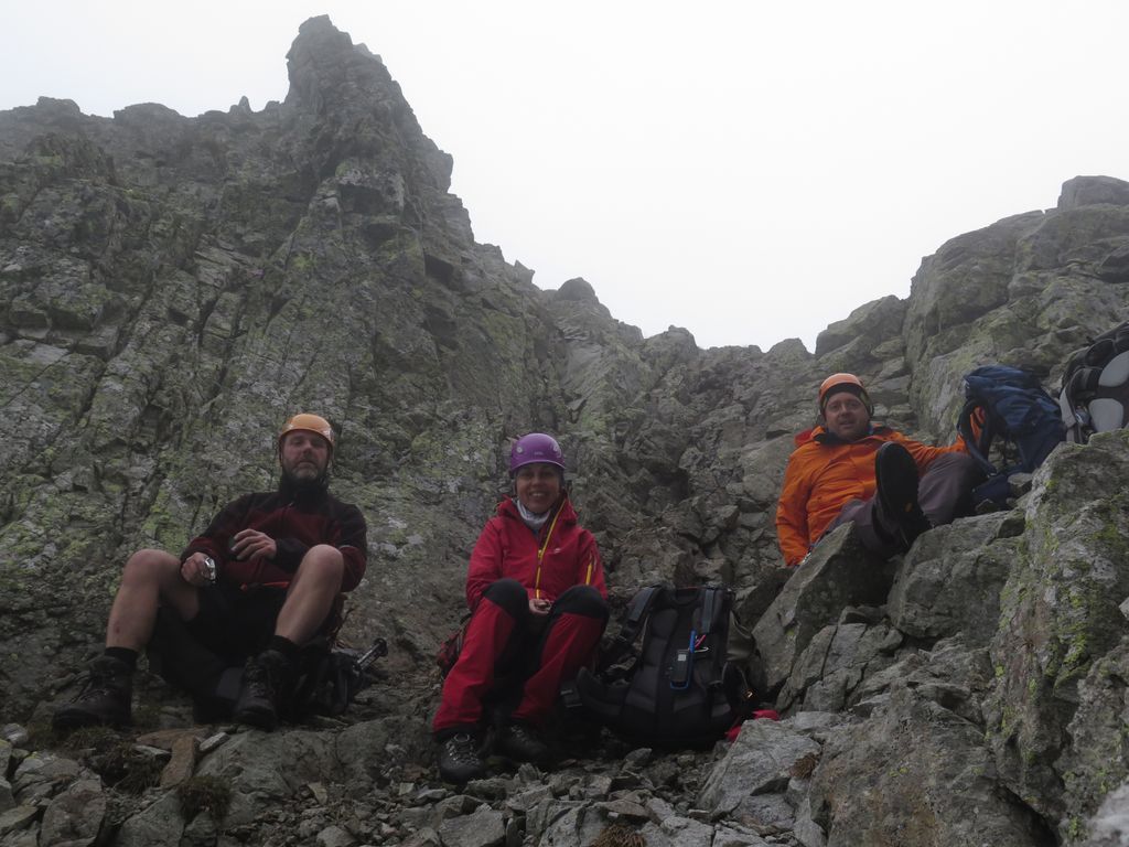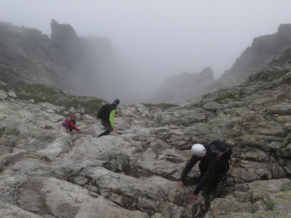 Marcel s Jířou jsou již nějaký čas vpředu, nováčci potřebují více péče, ale jsou výborní! Zkušená Ade rozdává morál, Šíma překvapuje přehledem a pohodou, Káčko je každým metrem jistější – skvělá skupina. Po doplnění energie a tekutin vyrážíme vstříc poslednímu úseku s občasnými řetězy, které místy zdatně (nechtěně) vynecháváme a jdeme svoji cestou. Já nadšený, neb je lezecká, zbytek ani nedutá, leč stoupá bravurně. Co jim také zbývá… Viditelnost spíše minimální. 15:00 vrchol.