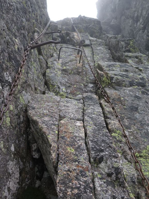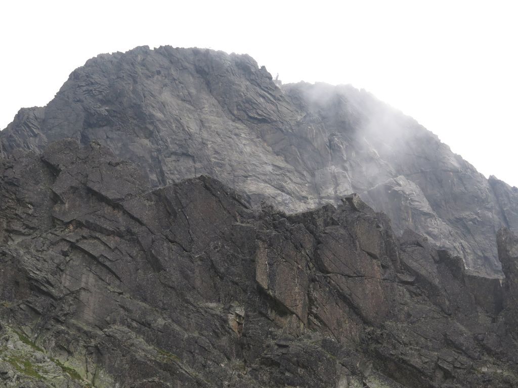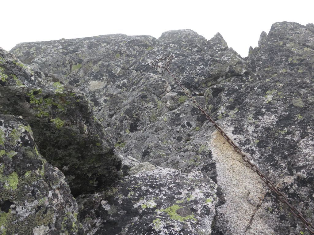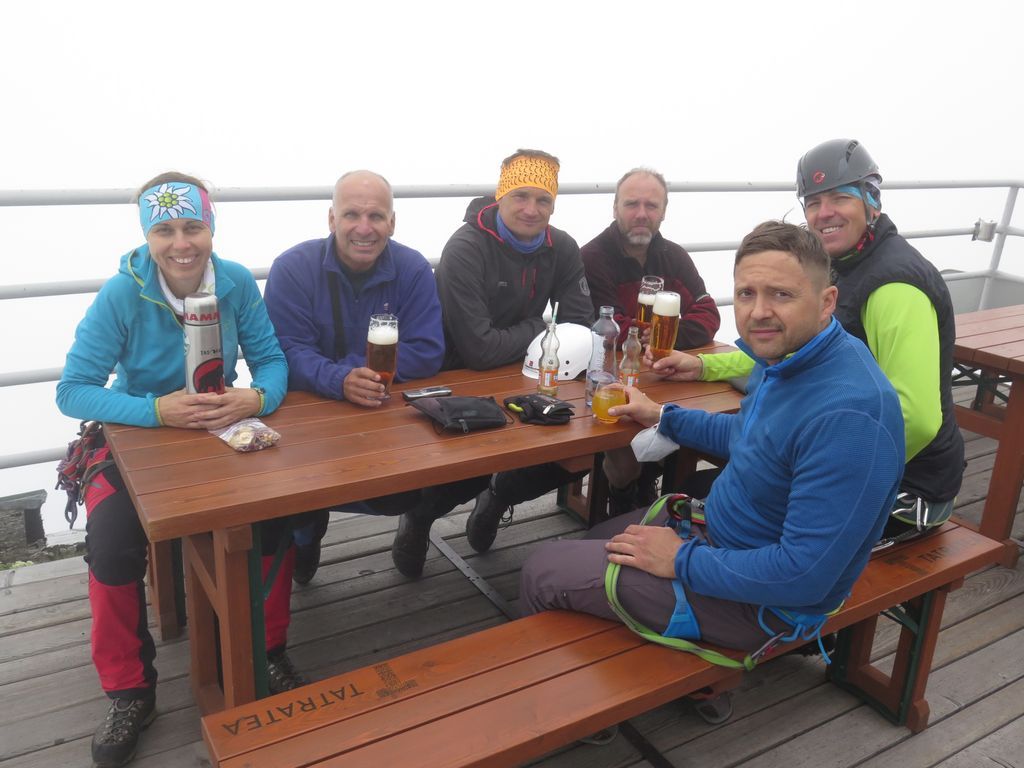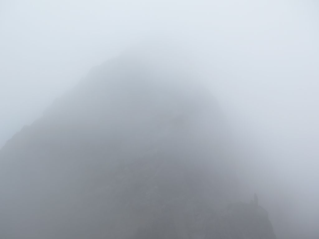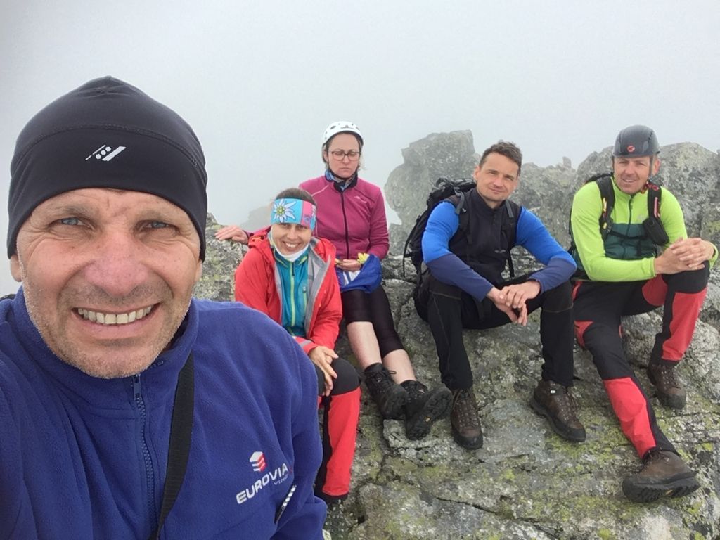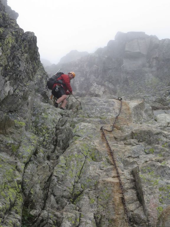 Marcel s Jířou jsou již nějaký čas vpředu, nováčci potřebují více péče, ale jsou výborní! Zkušená Ade rozdává morál, Šíma překvapuje přehledem a pohodou, Káčko je každým metrem jistější – skvělá skupina. Po doplnění energie a tekutin vyrážíme vstříc poslednímu úseku s občasnými řetězy, které místy zdatně (nechtěně) vynecháváme a jdeme svoji cestou. Já nadšený, neb je lezecká, zbytek ani nedutá, leč stoupá bravurně. Co jim také zbývá… Viditelnost spíše minimální. 15:00 vrchol.