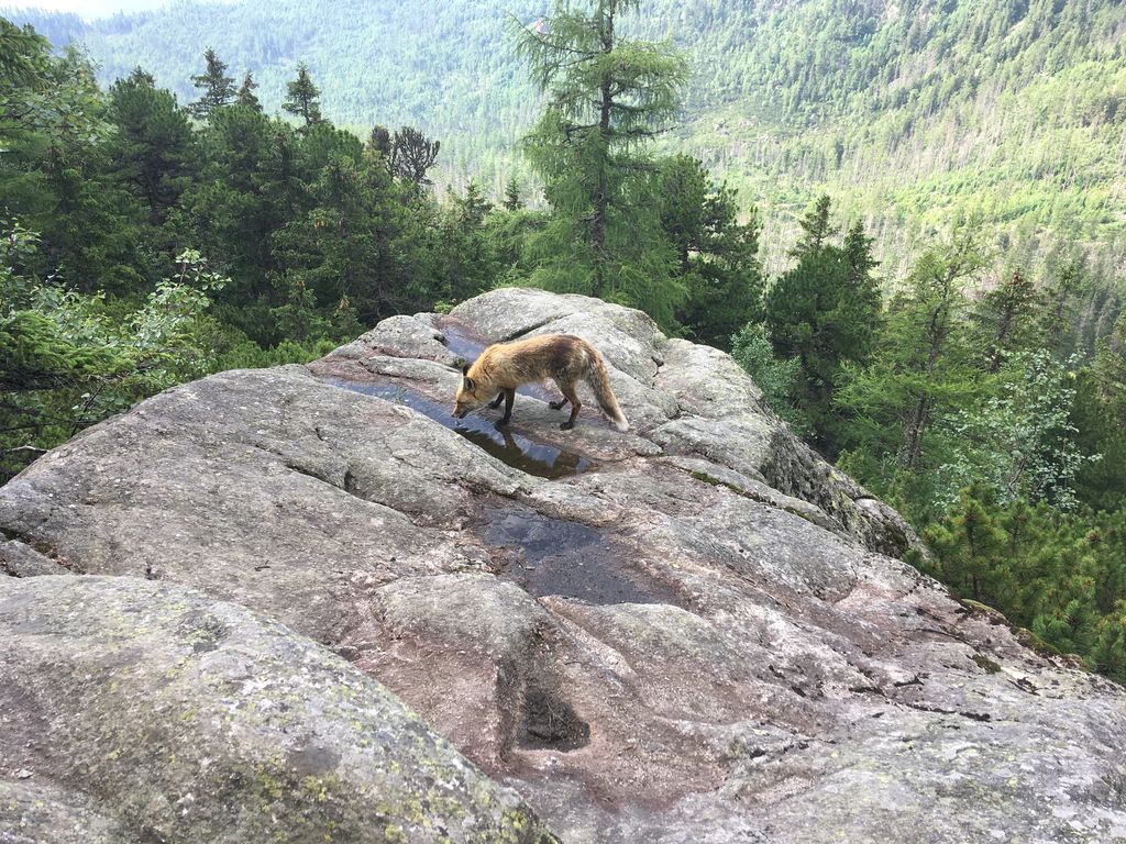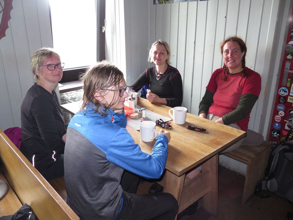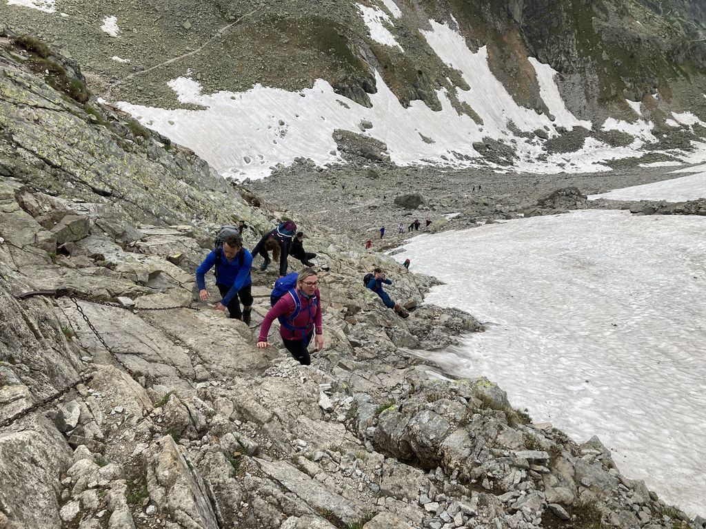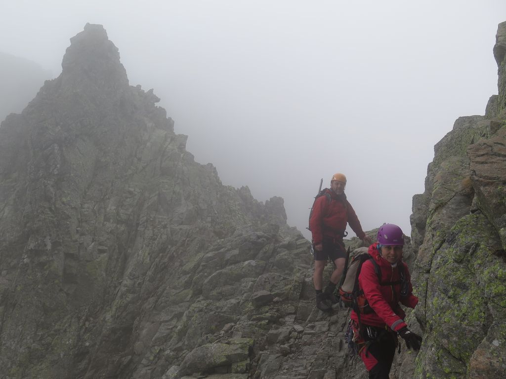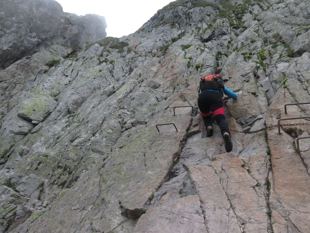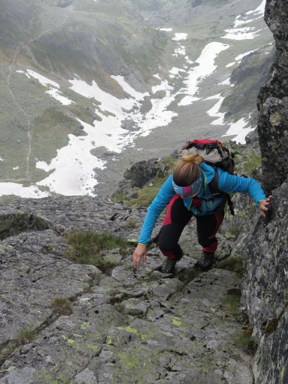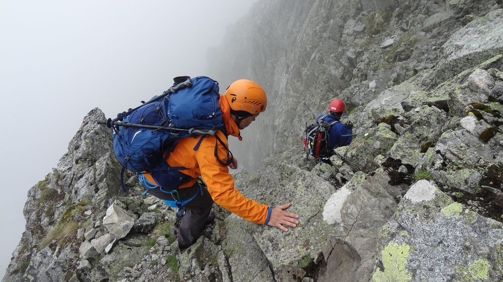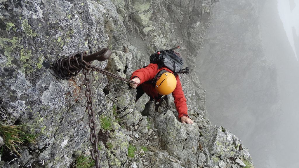 Marcel s Jířou jsou již nějaký čas vpředu, nováčci potřebují více péče, ale jsou výborní! Zkušená Ade rozdává morál, Šíma překvapuje přehledem a pohodou, Káčko je každým metrem jistější – skvělá skupina. Po doplnění energie a tekutin vyrážíme vstříc poslednímu úseku s občasnými řetězy, které místy zdatně (nechtěně) vynecháváme a jdeme svoji cestou. Já nadšený, neb je lezecká, zbytek ani nedutá, leč stoupá bravurně. Co jim také zbývá… Viditelnost spíše minimální. 15:00 vrchol.