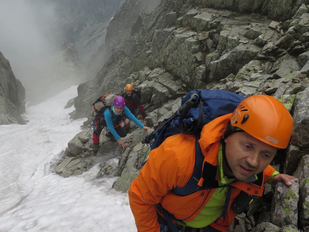 V 10:15 se strojíme do sedáků, bereme přilby, lana jsou v pohotovosti. Mělo by to jít po skále vedle sněhového splazu. Daří se, dvojkové lezení po pár metrech dává jistotu všem, lana odpočívají. A takto i s občasným hledáním té správné cesty dorážíme v 13:15 na hřeben.