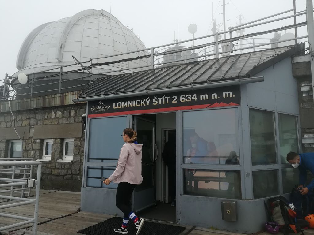 Setkáváme se s M+J, spousta radosti a uvolnění mezi námi. Vrcholová pohoda v mracích, posezení, pivečko, doslova vrcholové, kde to zažijete! (Káčko se další den nad fotkami diví, že je nahoře observatoř. Ten výstup mu tedy dal.)