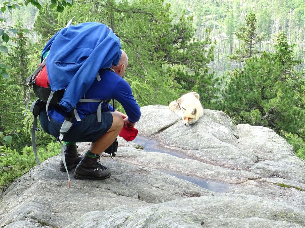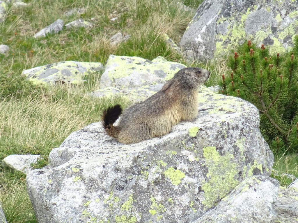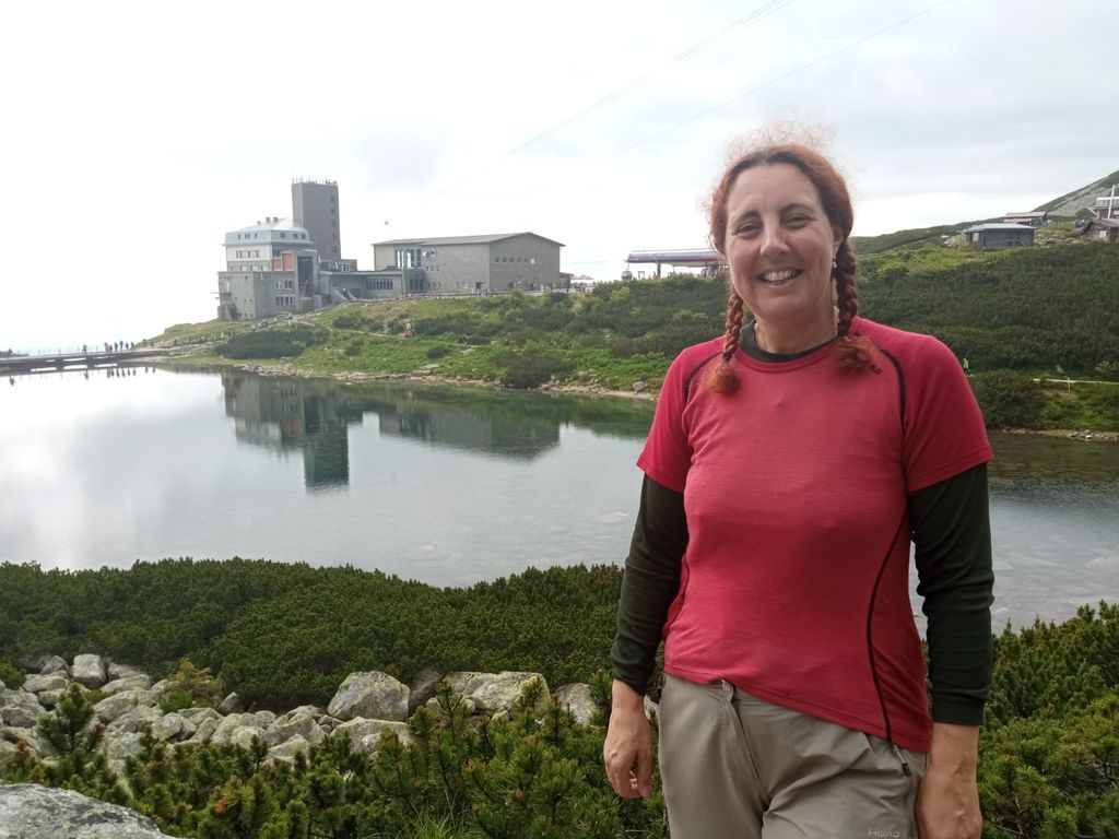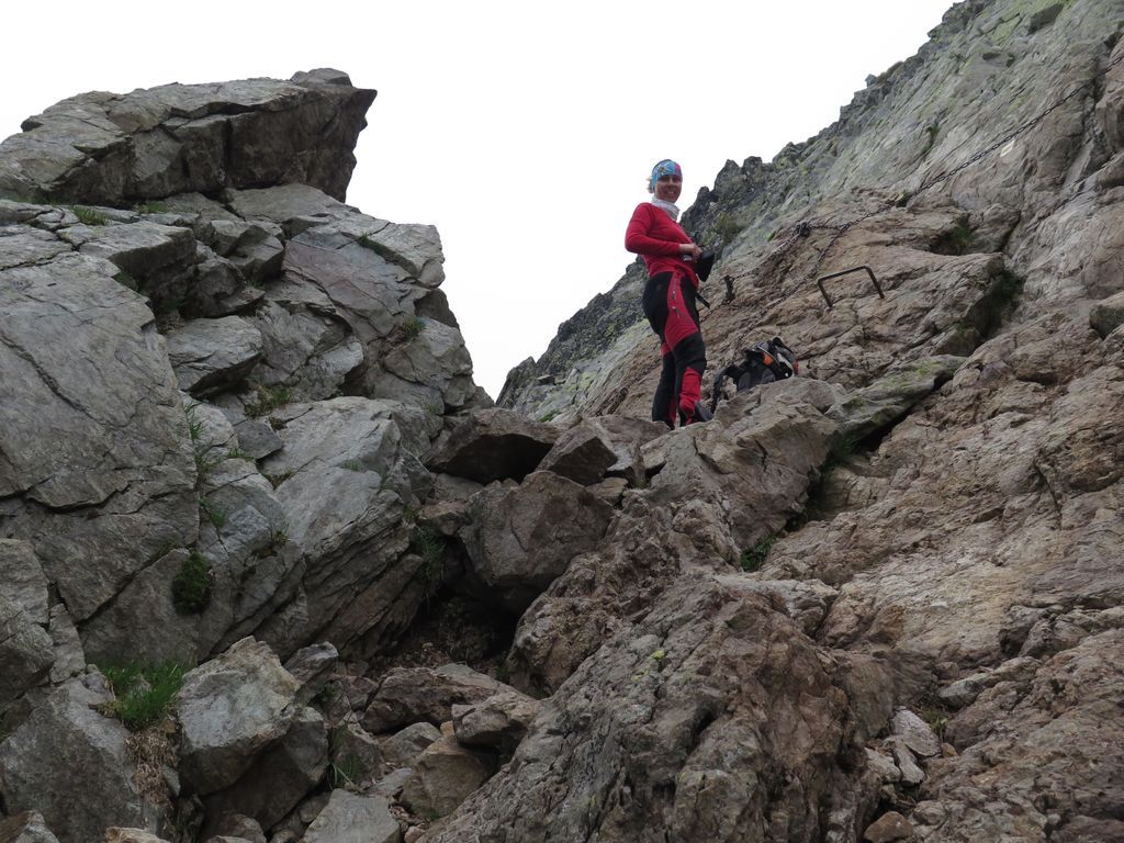 V pondělí 5.7. se dělíme na více skupin: Lenka s Davidem Slavkovského štít, Káčko relax po okolí, nakonec došel až na Svišťovku, Jana Skalnaté pleso se zdejší kamarádkou (foto), já s Ade Pyšný štít a zbytek zatím odpočívá tělem i hlavou. S Ade tedy vyrážíme v 8:15 potřetí na Terrynu. Počasí přeje, ale u Terryny se na Pyšný navalují černé mraky, lézt a sestupovat v mokrém se nám nechce, vzdáváme to. Vyhrává Široká veža, tudíž veškerou výzbroj a výstroj necháváme na Terryně. Nu, je to úleva. V Priečnem sedle vylezeném bez řetězů slyšíme ve vysílačce Marcela, Kláru, Šímu a Jířu, jsou u Terryny, jdou za námi. Šíma v sandálech zůstává bohužel pod řetězy. My zatím dosahujeme ve 12:30 vrcholu, opět v mlze. Slovenská Anglie… Ale příjemně se tam sedí, užíváme si ten klid. Za půl hodiny přichází zbytek, sedíme pospolu dál. Následuje bezpečný sestup do sedla, ze sedla, okolo svišťů příchod za Šímou na Terrynu. Vrcholové pivko, nabrat odložené věci a pomalu dolů. Takové loučení s tímto koutem. Večer společenské hry, povídání, příjemná zábava.